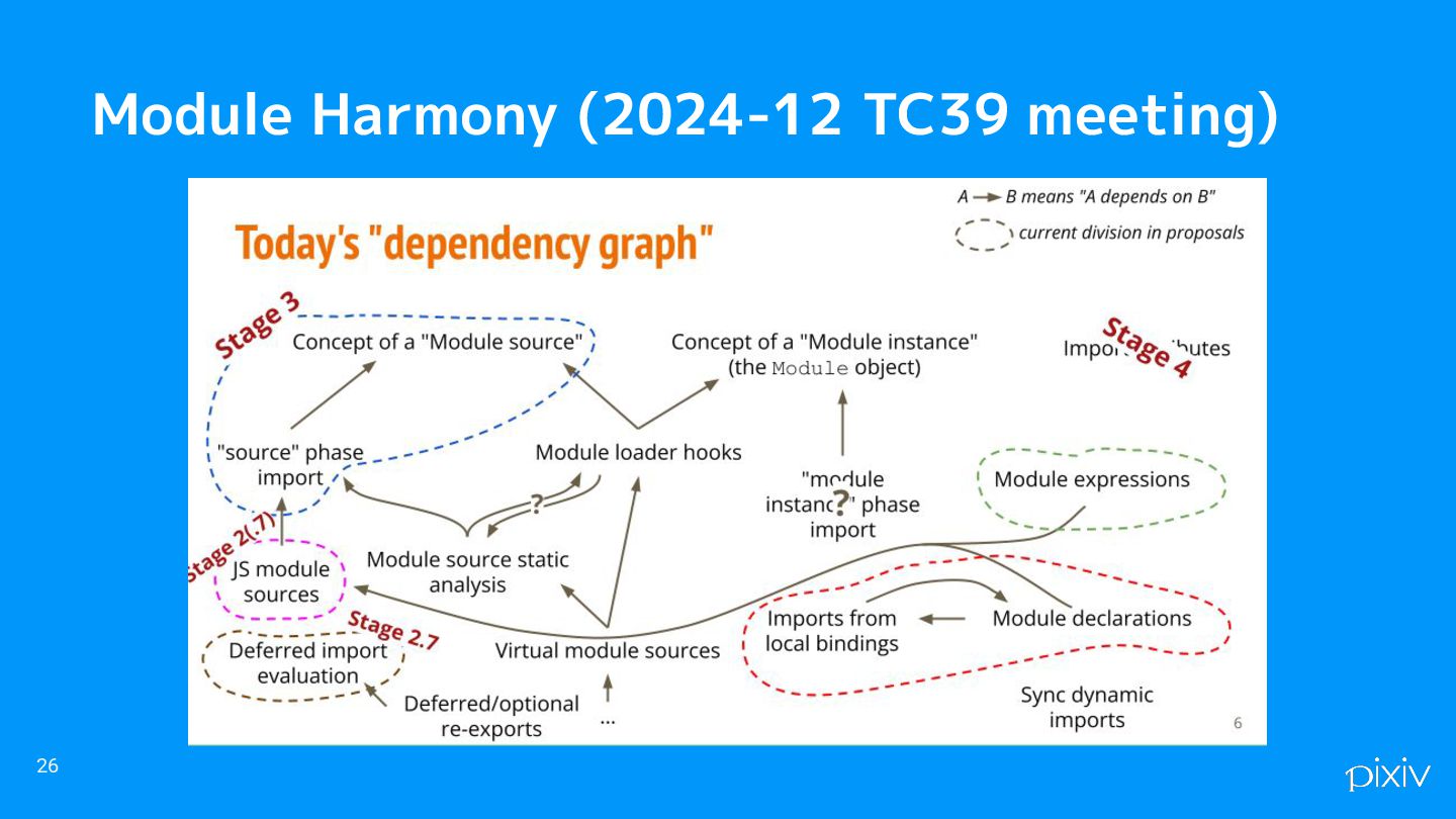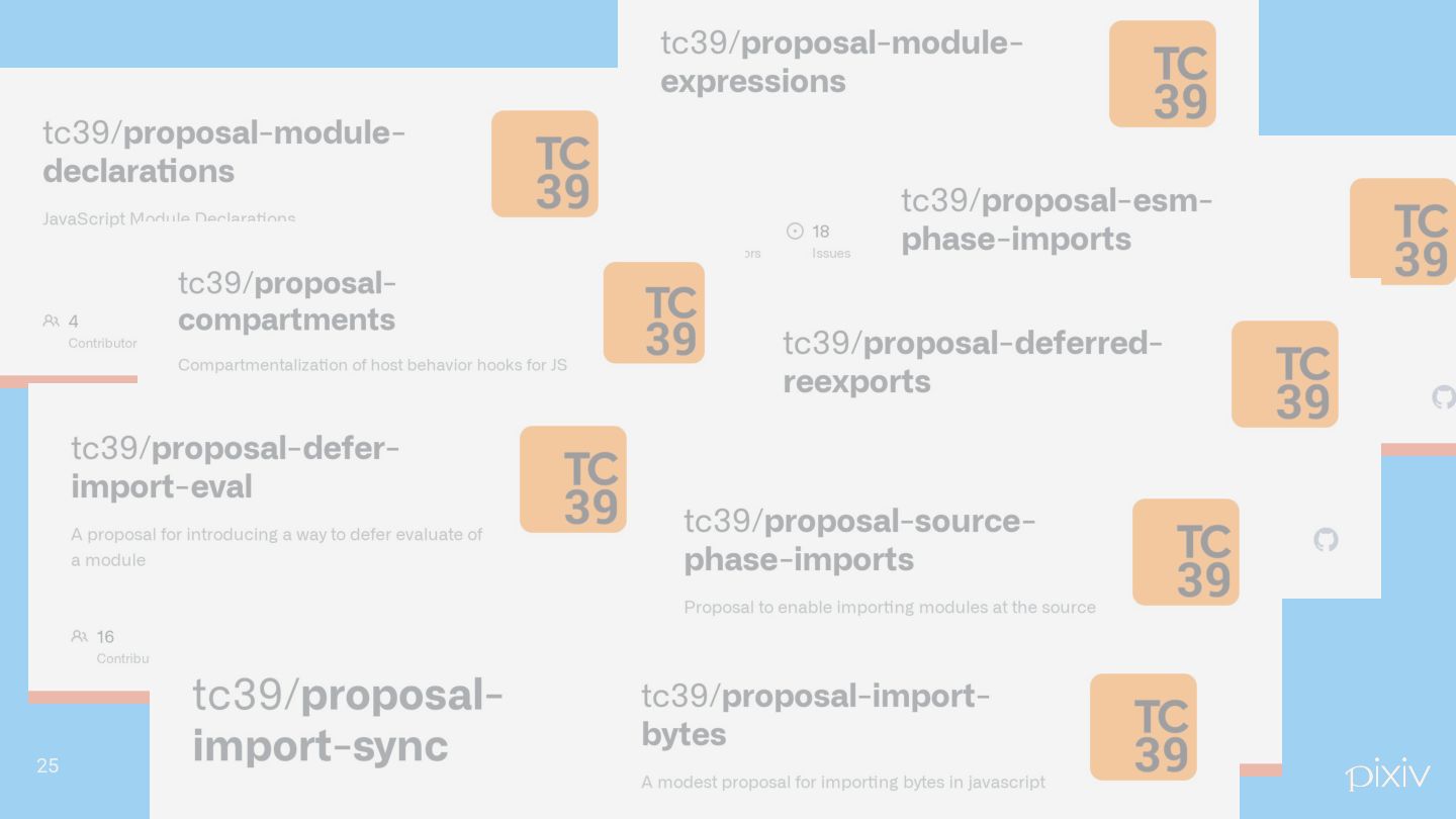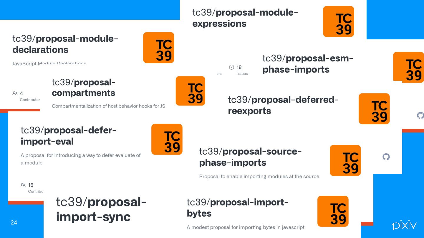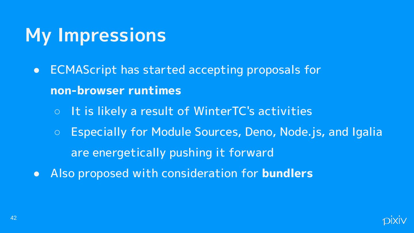 non-browser runtimes ◦ It is likely a result of WinterTC's activities ◦ Especially for Module Sources, Deno, Node.js, and Igalia are energetically pushing it forward • Also proposed with consideration for bundlers