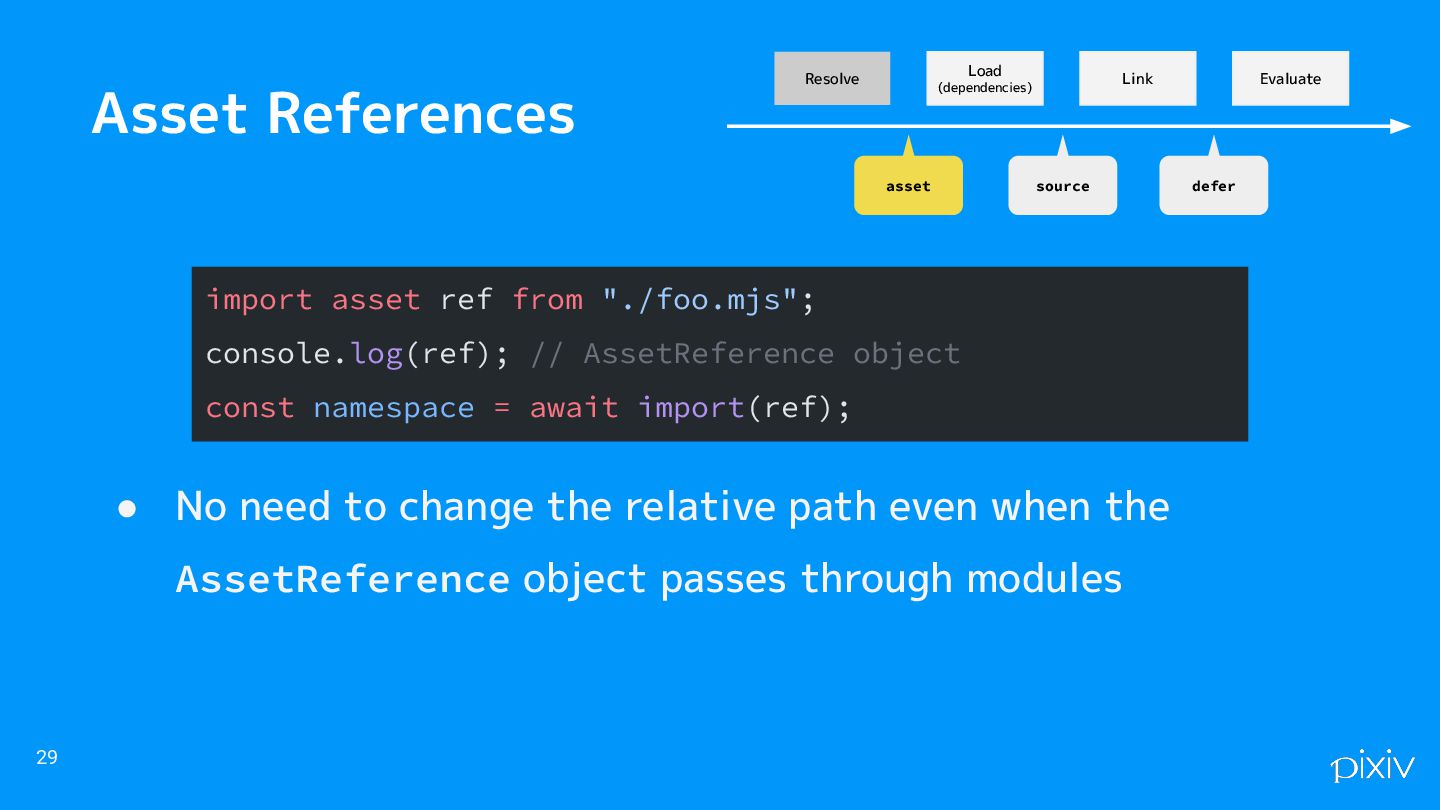 defer import asset ref from "./foo.mjs"; console.log(ref); // AssetReference object const namespace = await import(ref); • No need to change the relative path even when the AssetReference object passes through modules