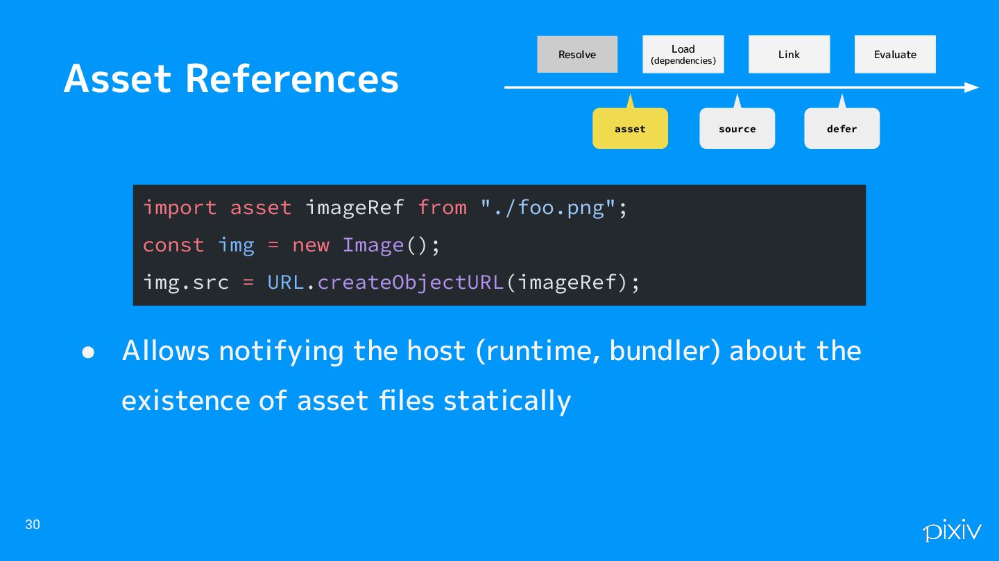 defer import asset imageRef from "./foo.png"; const img = new Image(); img.src = URL.createObjectURL(imageRef); • Allows notifying the host (runtime, bundler) about the existence of asset files statically