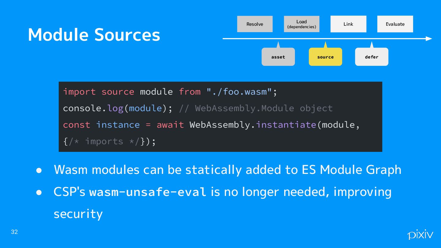 defer import source module from "./foo.wasm"; console.log(module); // WebAssembly.Module object const instance = await WebAssembly.instantiate(module, {/* imports */}); • Wasm modules can be statically added to ES Module Graph • CSP's wasm-unsafe-eval is no longer needed, improving security