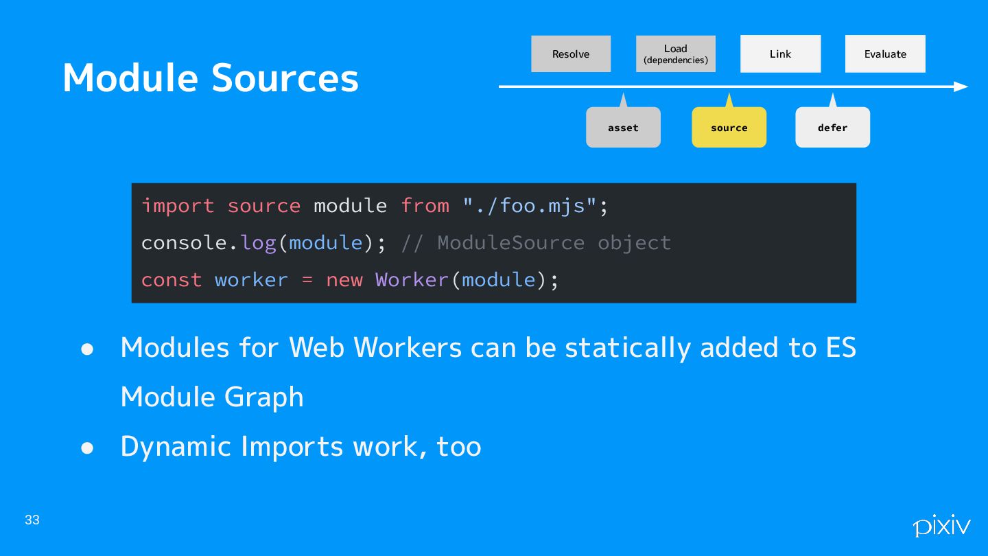 defer import source module from "./foo.mjs"; console.log(module); // ModuleSource object const worker = new Worker(module); • Modules for Web Workers can be statically added to ES Module Graph • Dynamic Imports work, too