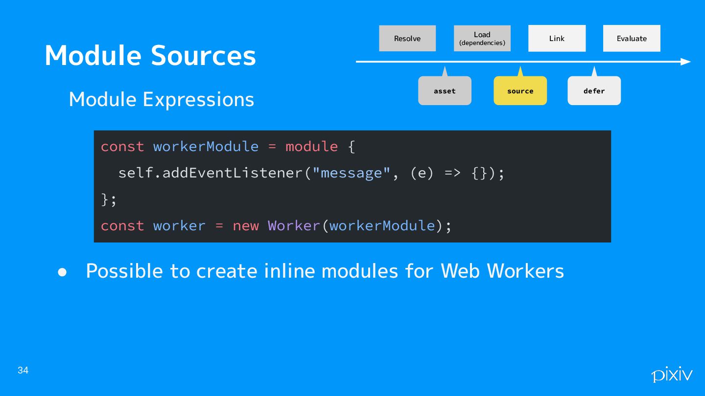 defer const workerModule = module { self.addEventListener("message", (e) => {}); }; const worker = new Worker(workerModule); Module Expressions • Possible to create inline modules for Web Workers