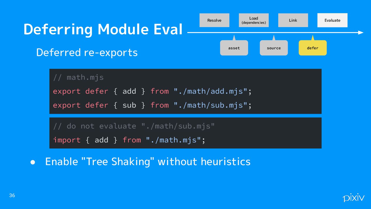 source defer // math.mjs export defer { add } from "./math/add.mjs"; export defer { sub } from "./math/sub.mjs"; • Enable "Tree Shaking" without heuristics Deferred re-exports // do not evaluate "./math/sub.mjs" import { add } from "./math.mjs";