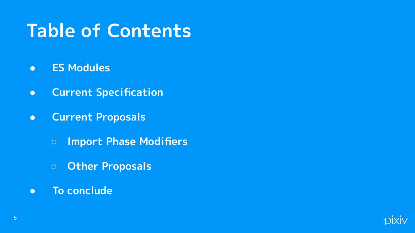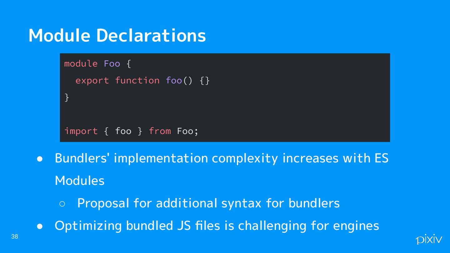 } import { foo } from Foo; • Bundlers' implementation complexity increases with ES Modules ◦ Proposal for additional syntax for bundlers • Optimizing bundled JS files is challenging for engines