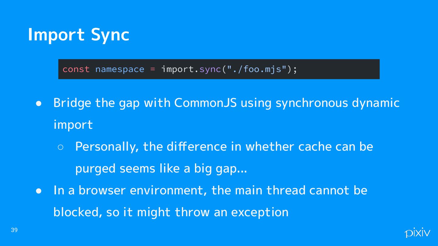 gap with CommonJS using synchronous dynamic import ◦ Personally, the difference in whether cache can be purged seems like a big gap... • In a browser environment, the main thread cannot be blocked, so it might throw an exception