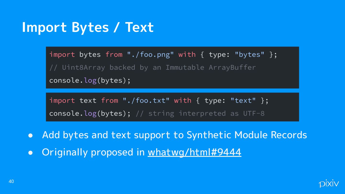 { type: "bytes" }; // Uint8Array backed by an Immutable ArrayBuffer console.log(bytes); • Add bytes and text support to Synthetic Module Records • Originally proposed in whatwg/html#9444 import text from "./foo.txt" with { type: "text" }; console.log(bytes); // string interpreted as UTF-8
