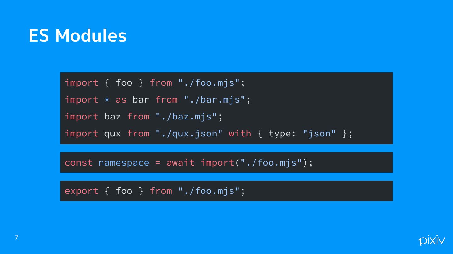 3. 7 ES Modules import { foo } from "./foo.mjs"; import