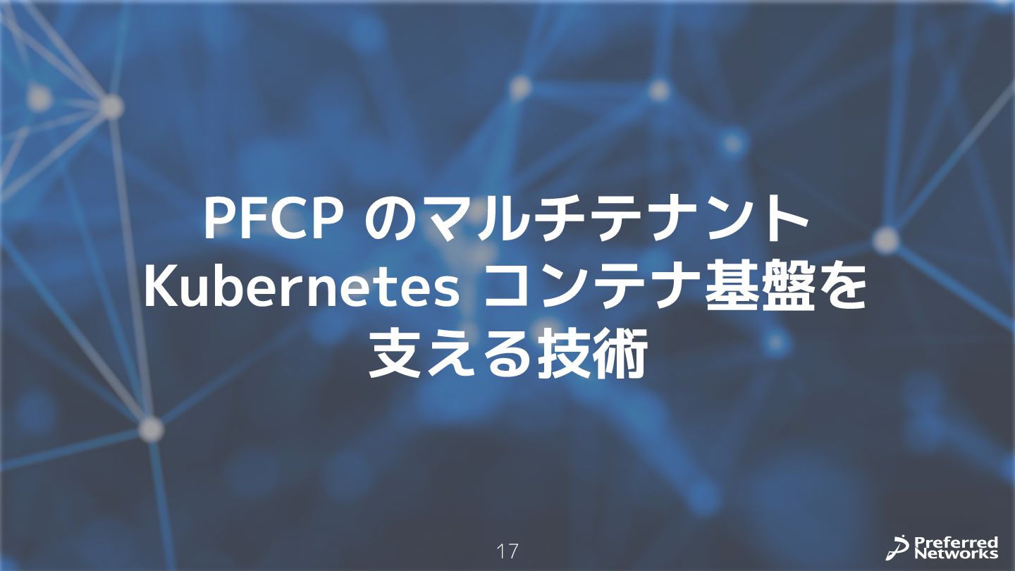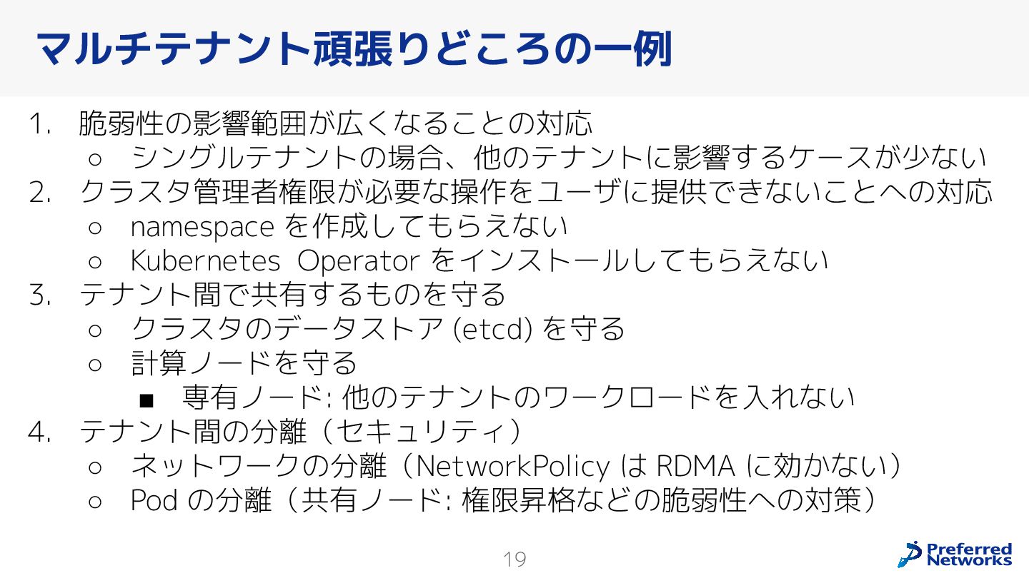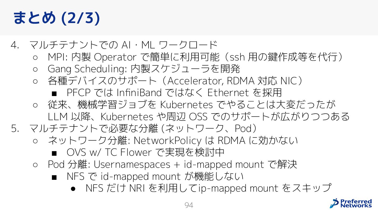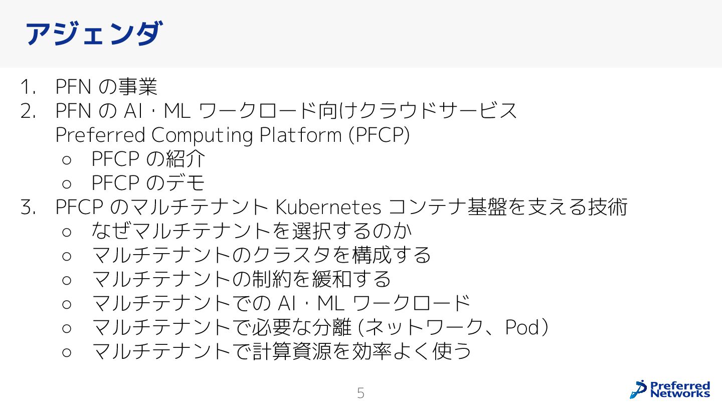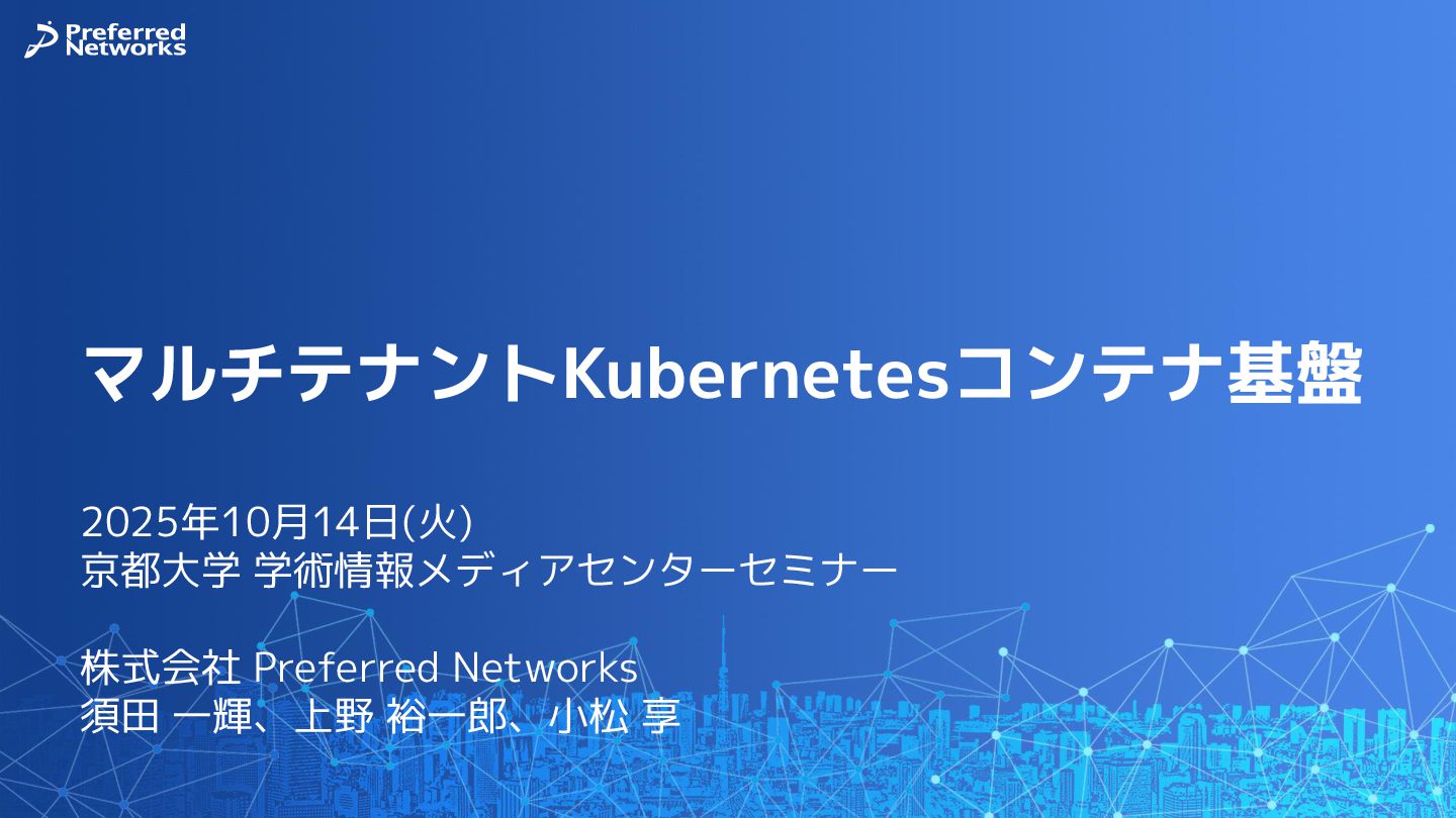 Preferred Networksでは、AI/MLワークロード向けのクラウドサービスである「Preferred Computing Platform (PFCP)」をマルチテナントKubernetesコンテナ基盤として提供している。本講演では、複数ユーザが利用するマルチテナント基盤で重要となる、Kubernetes APIレベルでの権限分離とその強制、同一ホスト上でのプロセス・データの分離、同一ネットワーク内での通信分離等のアイソレーション技術、限られた計算リソースの公平制御、および課金システムについて、その実現のための技術と設計思想について説明する。また、Kubernetes上でAI/ML ワークロードを実行するために必要なアクセラレータのサポート、RDMAを含めHPCアプリケーションを実行する上で必要になる基本的な技術、複数の拠点にスケール可能なシステム構成等、PFCP全体についても概説する。