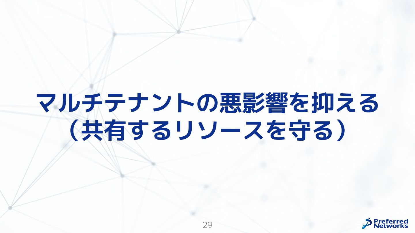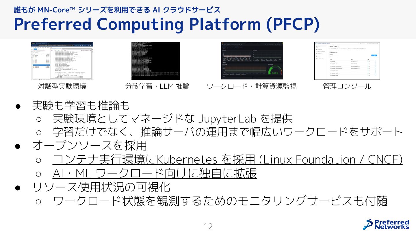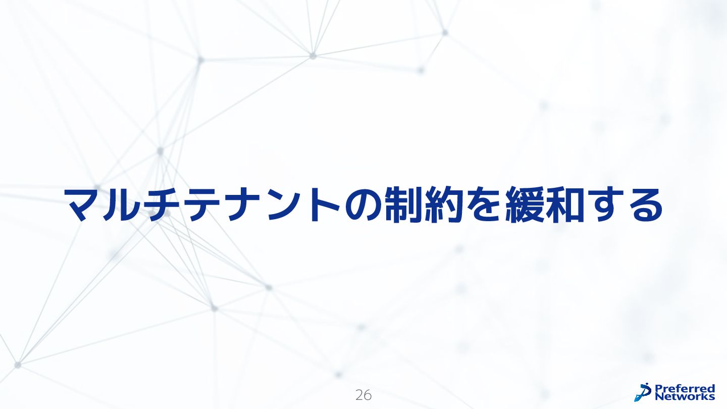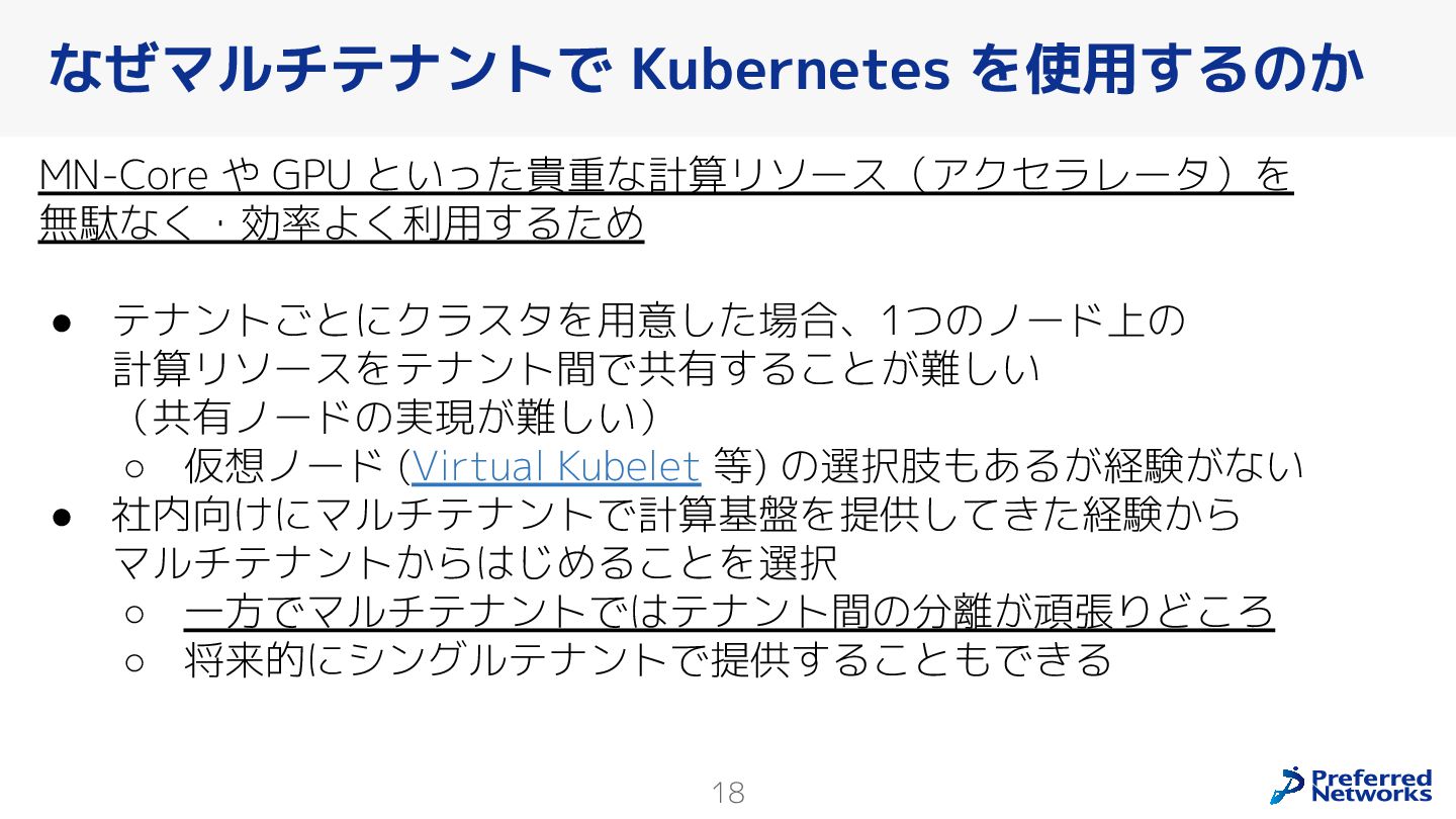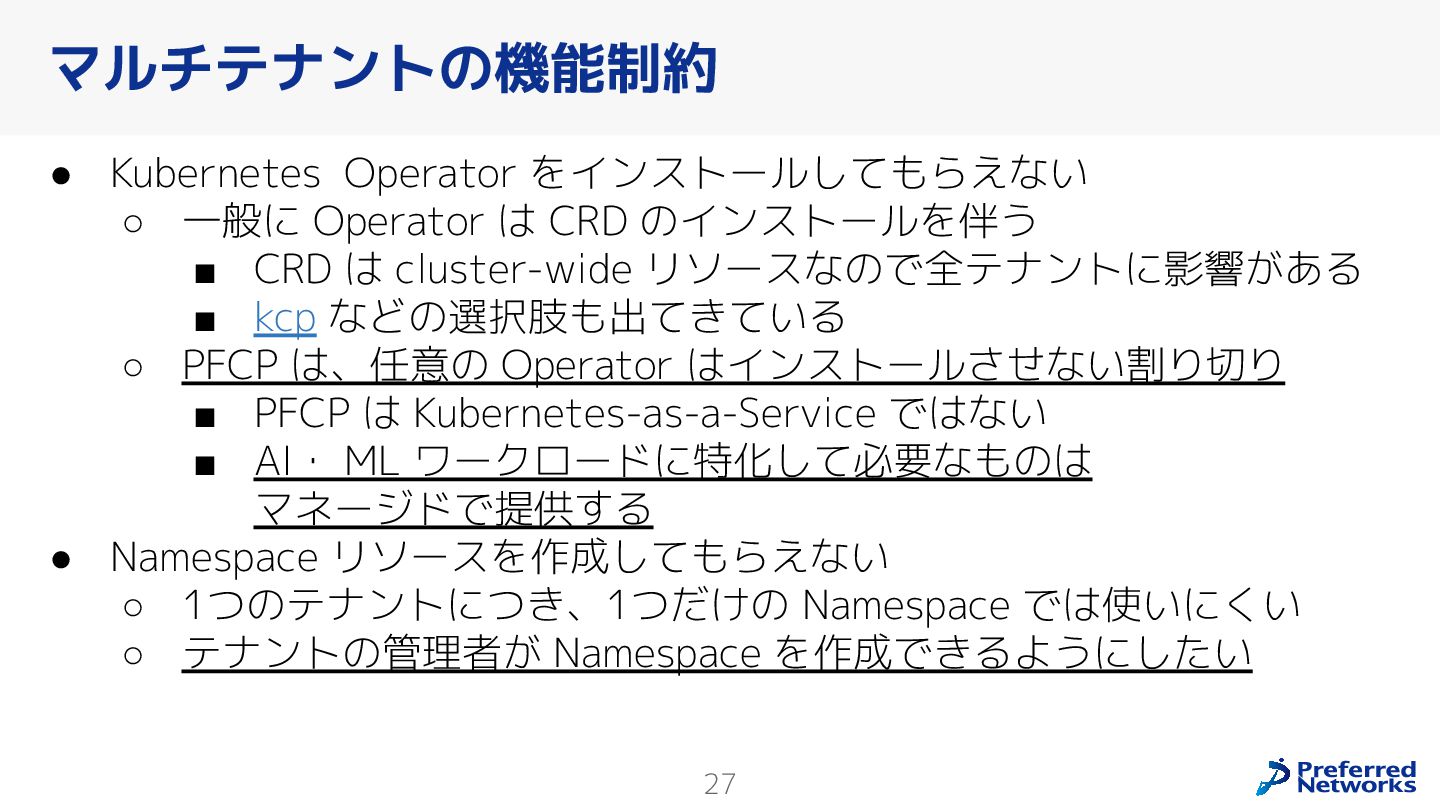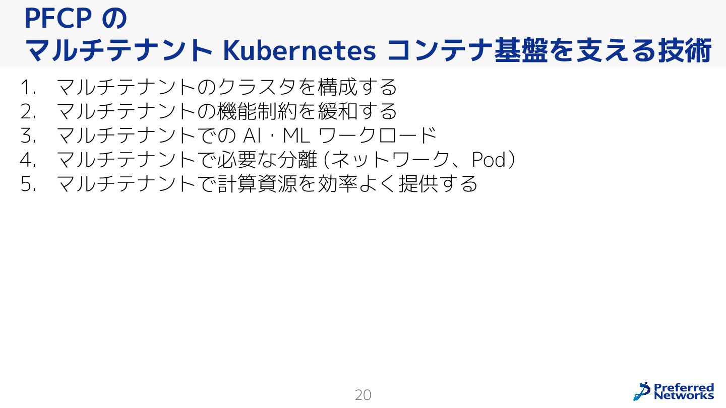 Preferred Networksでは、AI/MLワークロード向けのクラウドサービスである「Preferred Computing Platform (PFCP)」をマルチテナントKubernetesコンテナ基盤として提供している。本講演では、複数ユーザが利用するマルチテナント基盤で重要となる、Kubernetes APIレベルでの権限分離とその強制、同一ホスト上でのプロセス・データの分離、同一ネットワーク内での通信分離等のアイソレーション技術、限られた計算リソースの公平制御、および課金システムについて、その実現のための技術と設計思想について説明する。また、Kubernetes上でAI/ML ワークロードを実行するために必要なアクセラレータのサポート、RDMAを含めHPCアプリケーションを実行する上で必要になる基本的な技術、複数の拠点にスケール可能なシステム構成等、PFCP全体についても概説する。