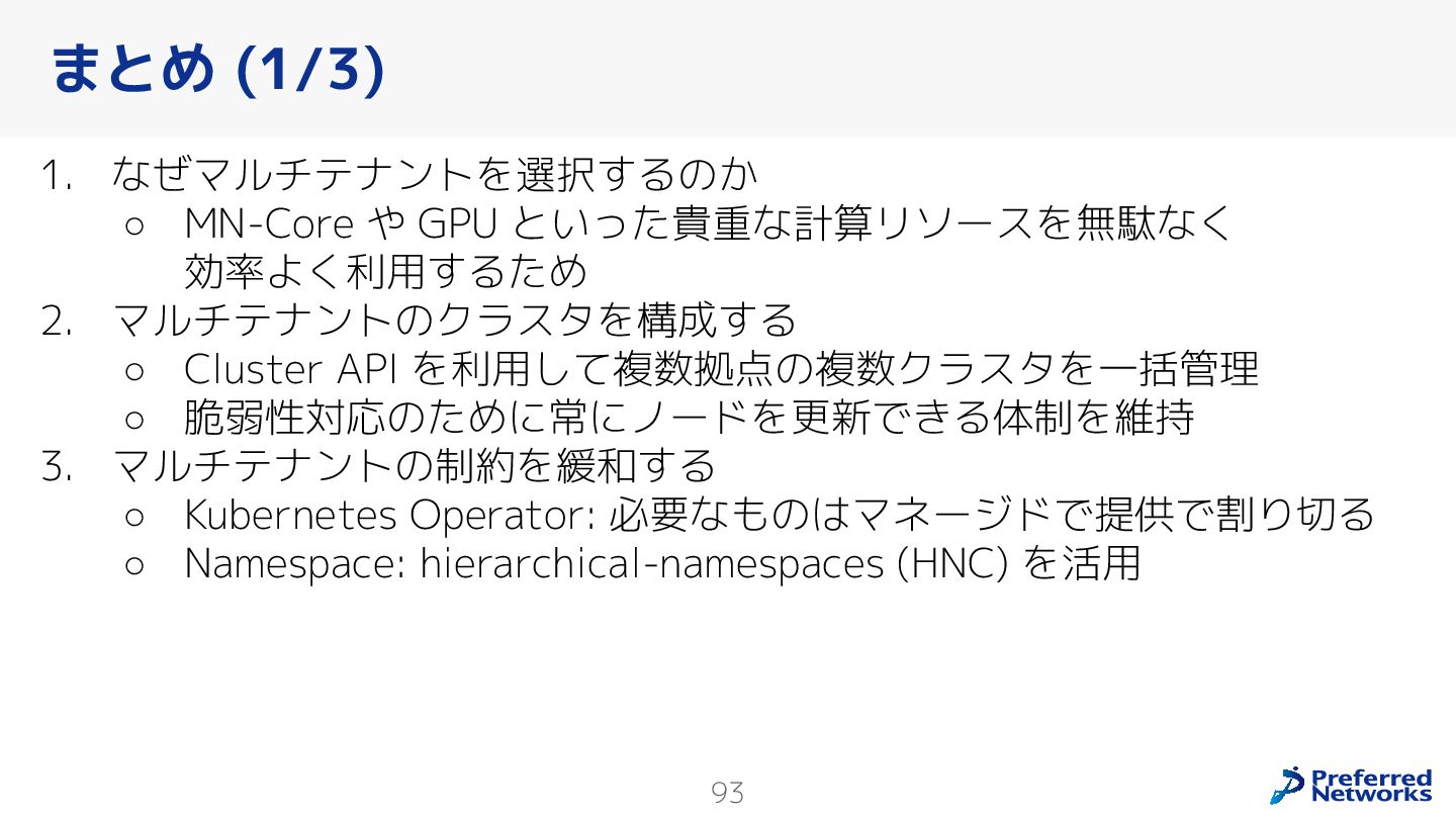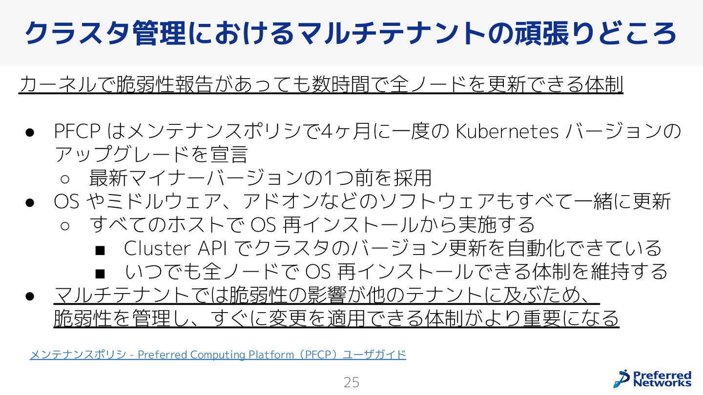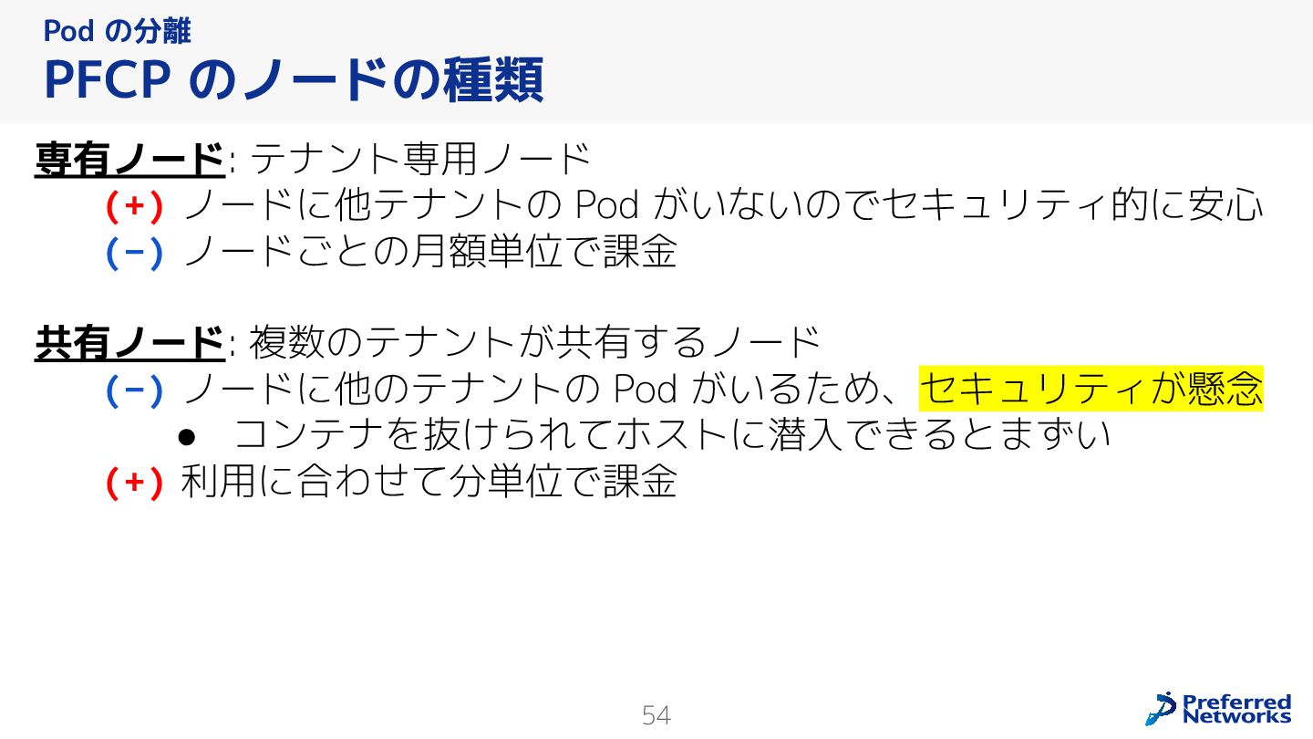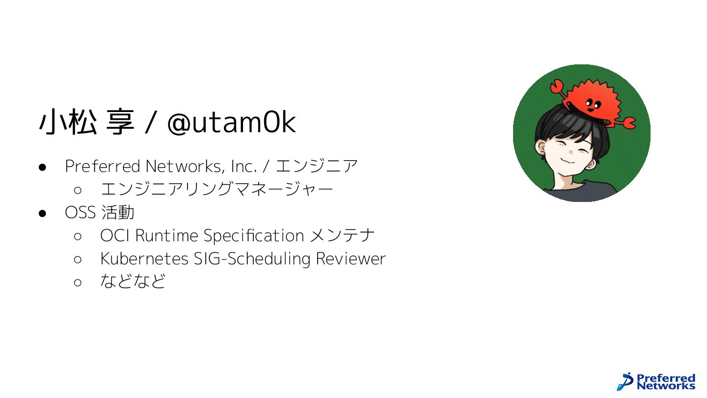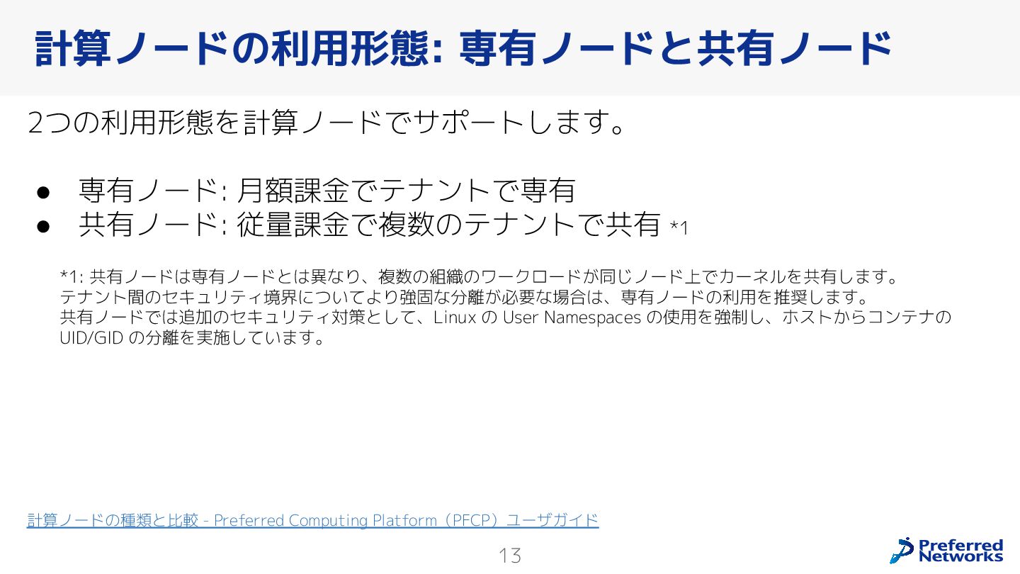 Preferred Networksでは、AI/MLワークロード向けのクラウドサービスである「Preferred Computing Platform (PFCP)」をマルチテナントKubernetesコンテナ基盤として提供している。本講演では、複数ユーザが利用するマルチテナント基盤で重要となる、Kubernetes APIレベルでの権限分離とその強制、同一ホスト上でのプロセス・データの分離、同一ネットワーク内での通信分離等のアイソレーション技術、限られた計算リソースの公平制御、および課金システムについて、その実現のための技術と設計思想について説明する。また、Kubernetes上でAI/ML ワークロードを実行するために必要なアクセラレータのサポート、RDMAを含めHPCアプリケーションを実行する上で必要になる基本的な技術、複数の拠点にスケール可能なシステム構成等、PFCP全体についても概説する。