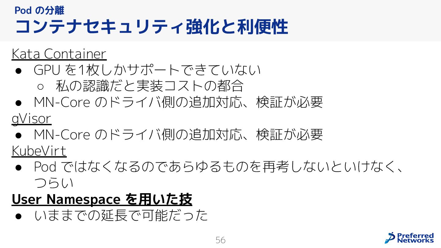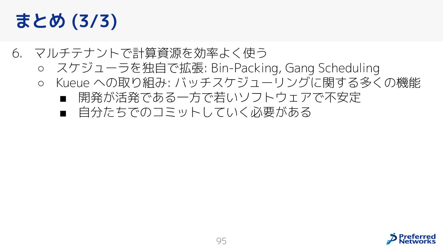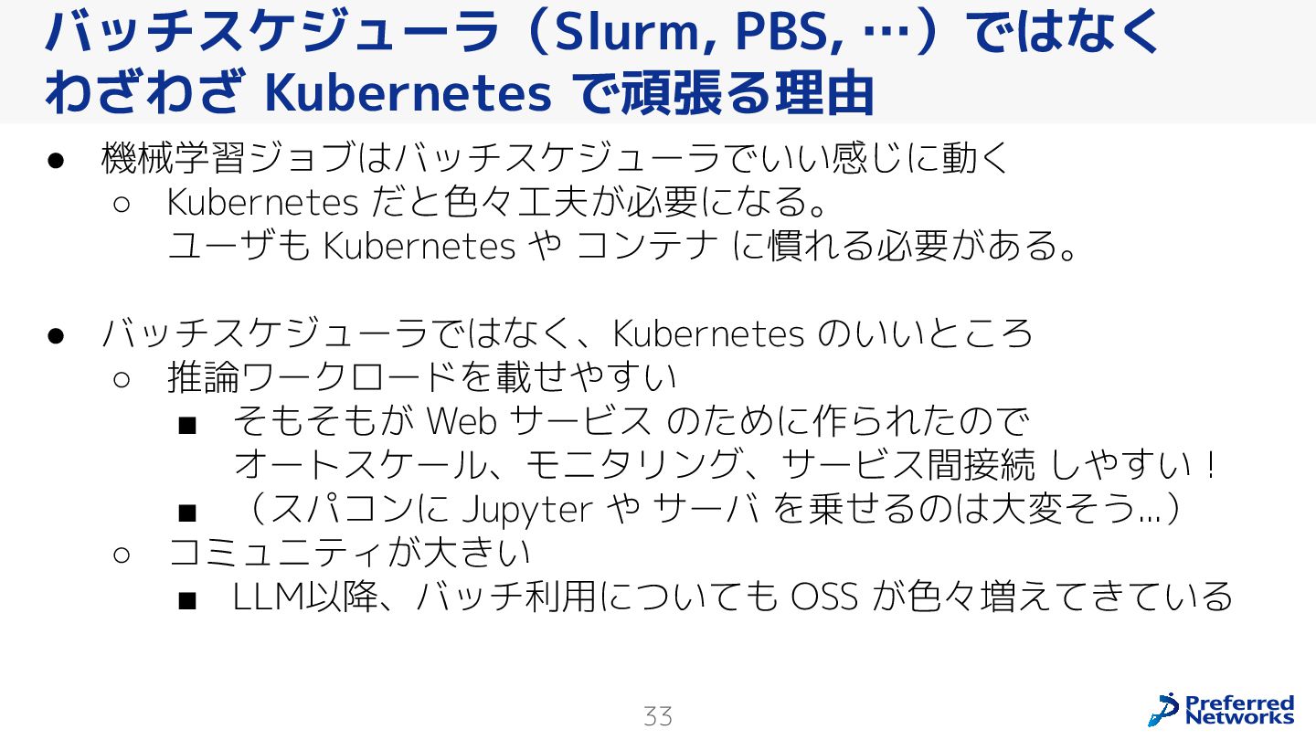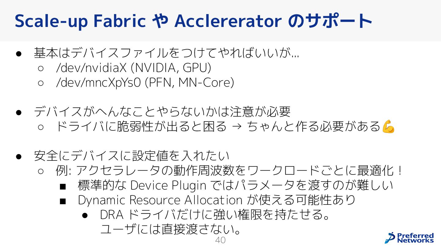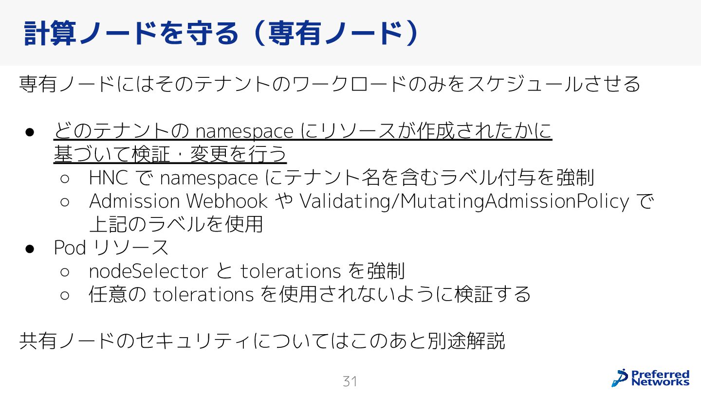 Preferred Networksでは、AI/MLワークロード向けのクラウドサービスである「Preferred Computing Platform (PFCP)」をマルチテナントKubernetesコンテナ基盤として提供している。本講演では、複数ユーザが利用するマルチテナント基盤で重要となる、Kubernetes APIレベルでの権限分離とその強制、同一ホスト上でのプロセス・データの分離、同一ネットワーク内での通信分離等のアイソレーション技術、限られた計算リソースの公平制御、および課金システムについて、その実現のための技術と設計思想について説明する。また、Kubernetes上でAI/ML ワークロードを実行するために必要なアクセラレータのサポート、RDMAを含めHPCアプリケーションを実行する上で必要になる基本的な技術、複数の拠点にスケール可能なシステム構成等、PFCP全体についても概説する。