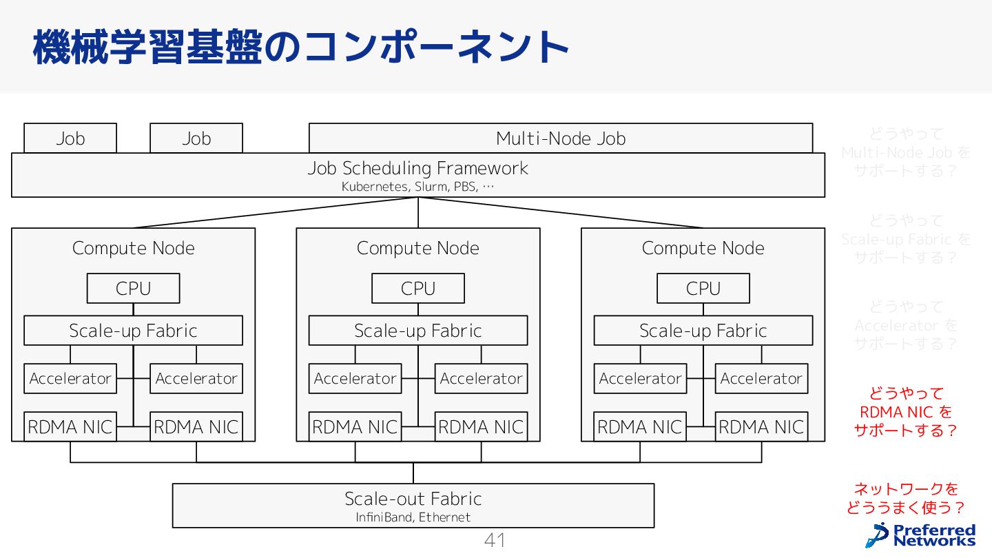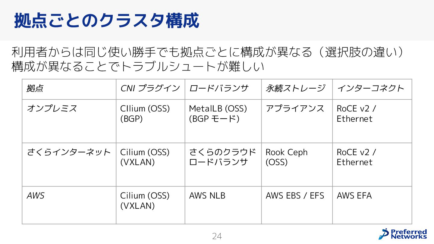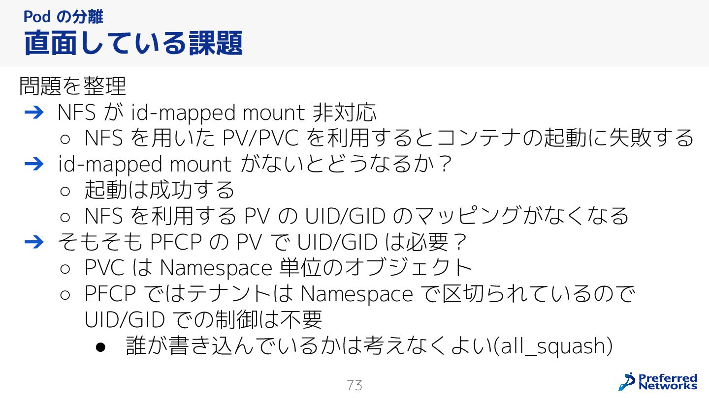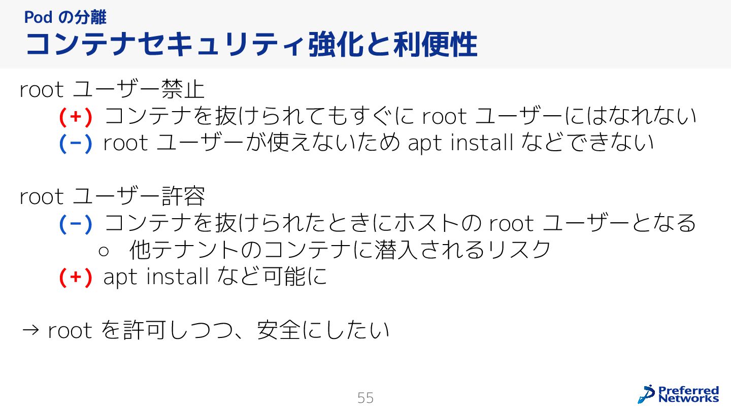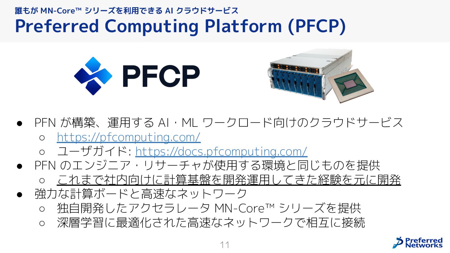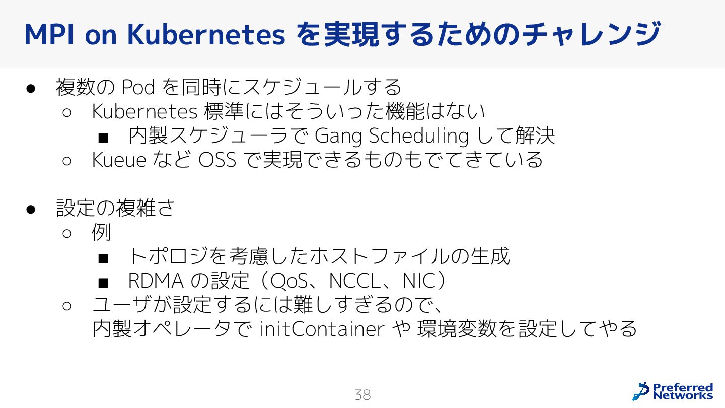 Preferred Networksでは、AI/MLワークロード向けのクラウドサービスである「Preferred Computing Platform (PFCP)」をマルチテナントKubernetesコンテナ基盤として提供している。本講演では、複数ユーザが利用するマルチテナント基盤で重要となる、Kubernetes APIレベルでの権限分離とその強制、同一ホスト上でのプロセス・データの分離、同一ネットワーク内での通信分離等のアイソレーション技術、限られた計算リソースの公平制御、および課金システムについて、その実現のための技術と設計思想について説明する。また、Kubernetes上でAI/ML ワークロードを実行するために必要なアクセラレータのサポート、RDMAを含めHPCアプリケーションを実行する上で必要になる基本的な技術、複数の拠点にスケール可能なシステム構成等、PFCP全体についても概説する。