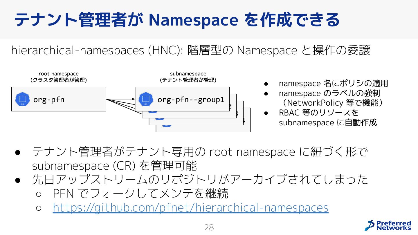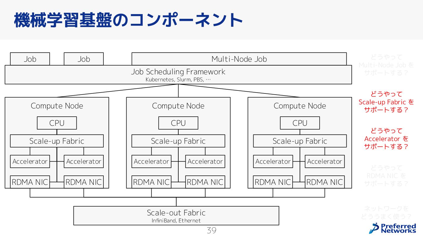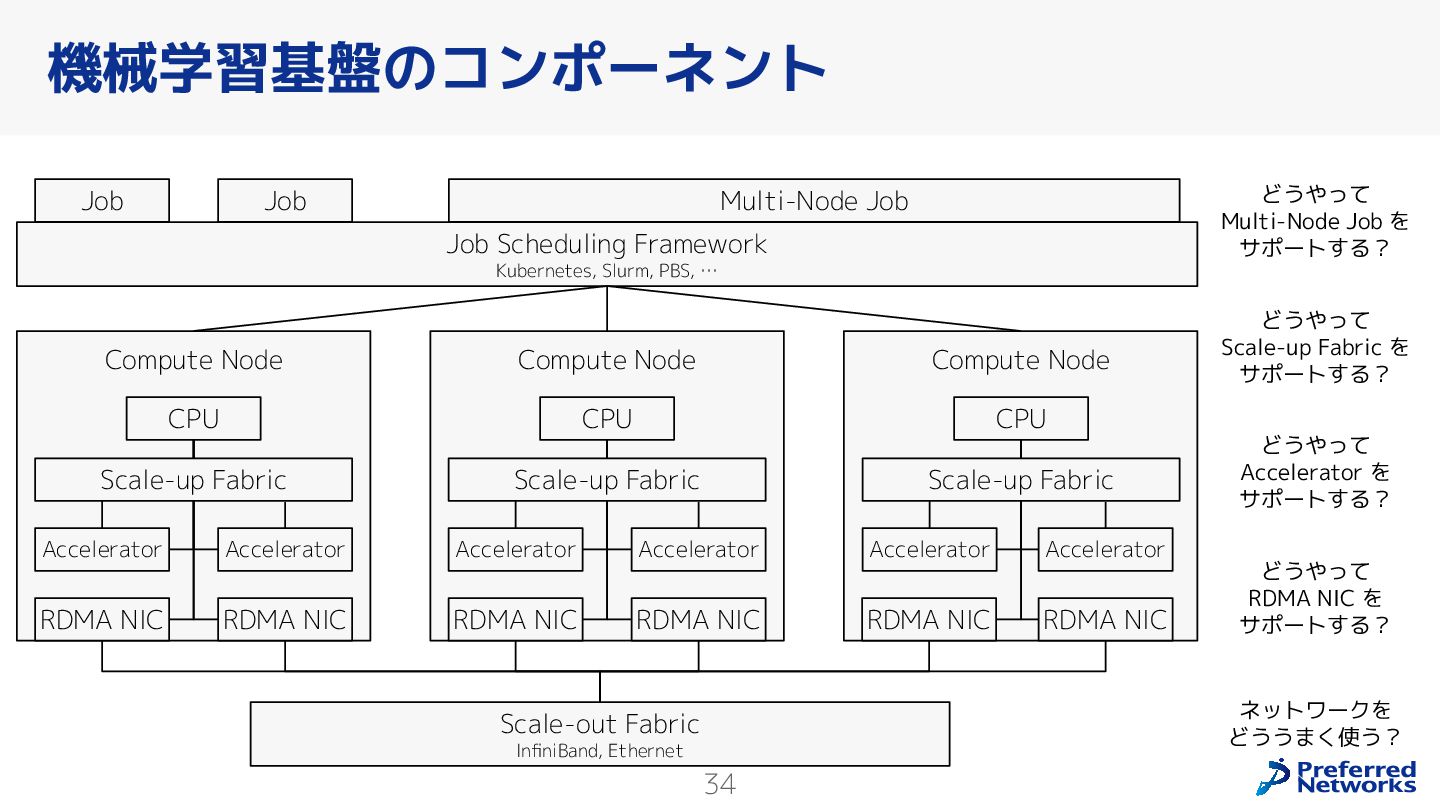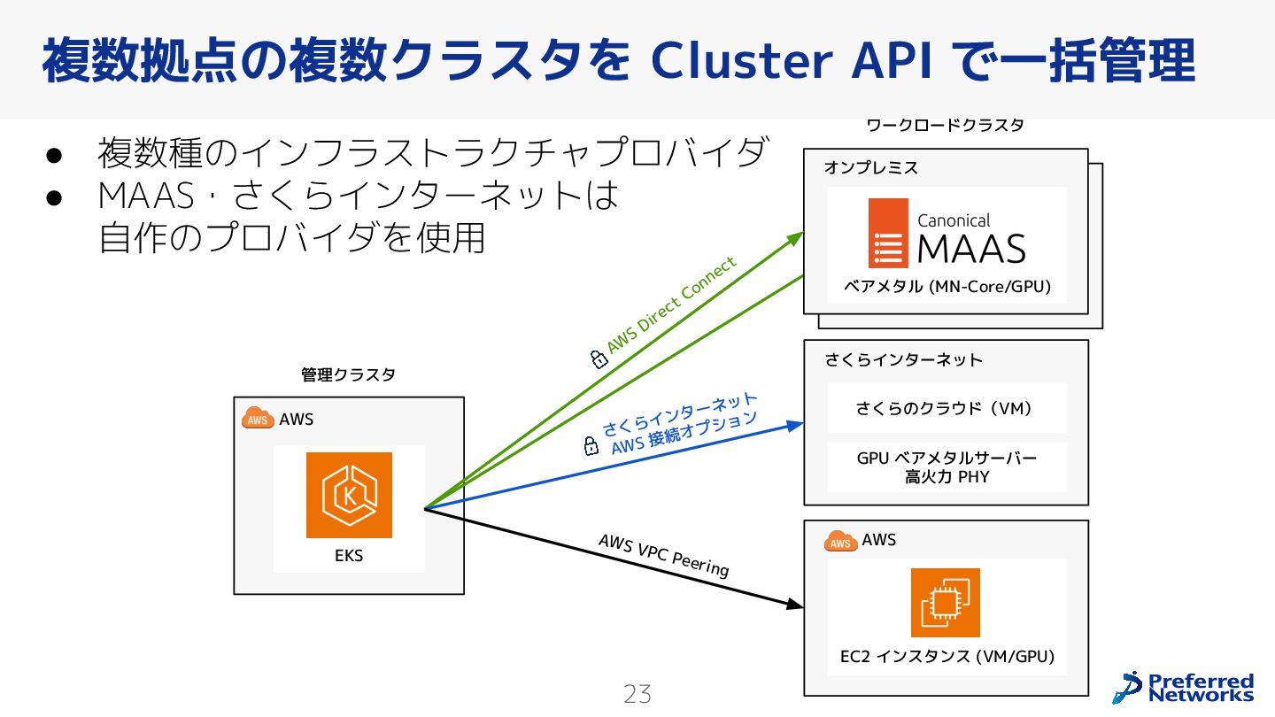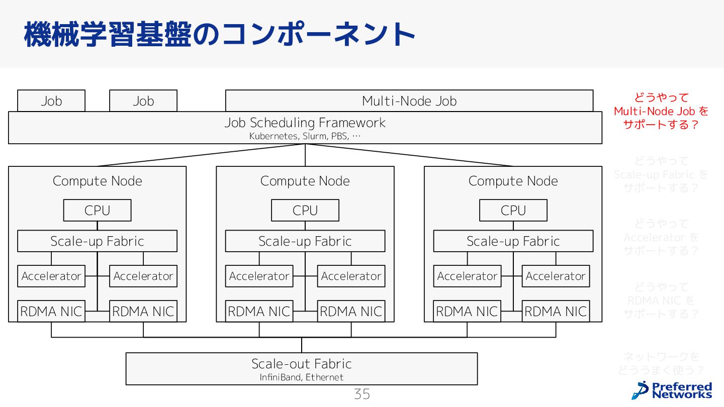 Preferred Networksでは、AI/MLワークロード向けのクラウドサービスである「Preferred Computing Platform (PFCP)」をマルチテナントKubernetesコンテナ基盤として提供している。本講演では、複数ユーザが利用するマルチテナント基盤で重要となる、Kubernetes APIレベルでの権限分離とその強制、同一ホスト上でのプロセス・データの分離、同一ネットワーク内での通信分離等のアイソレーション技術、限られた計算リソースの公平制御、および課金システムについて、その実現のための技術と設計思想について説明する。また、Kubernetes上でAI/ML ワークロードを実行するために必要なアクセラレータのサポート、RDMAを含めHPCアプリケーションを実行する上で必要になる基本的な技術、複数の拠点にスケール可能なシステム構成等、PFCP全体についても概説する。