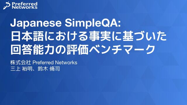 本報告では,大規模言語モデル(LLM)の日本語における事実に基づく回答能力(事実性)を評価するベンチマーク「Japanese SimpleQA」の構築と既存モデルの振る舞いについて述べる.Japanese SimpleQAは,短文で特定の事実について問う3000問の日本語質問応答からなるベンチマークである.SimpleQAと同様に,(1)最新のLLMにとっても高難度であり,(2)時間経過による正答の変化がなく,(3)別解が存在しない,質問応答で構成されている.この設計により,「モデルが自己の知識をどの程度正確に認識しているか」を評価できる.Japanese SimpleQAを用い,既存LLMの事実性や,RAGによる事実性の向上効果を明らかにした.構築したベンチマークは https://github.com/pfnet-research/japanese-simpleqa/ で公開している.