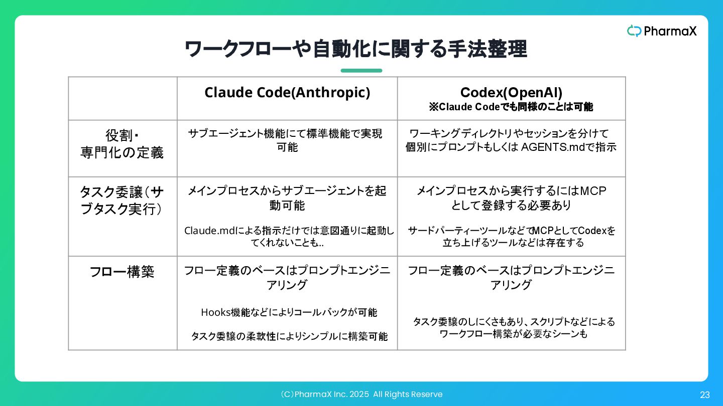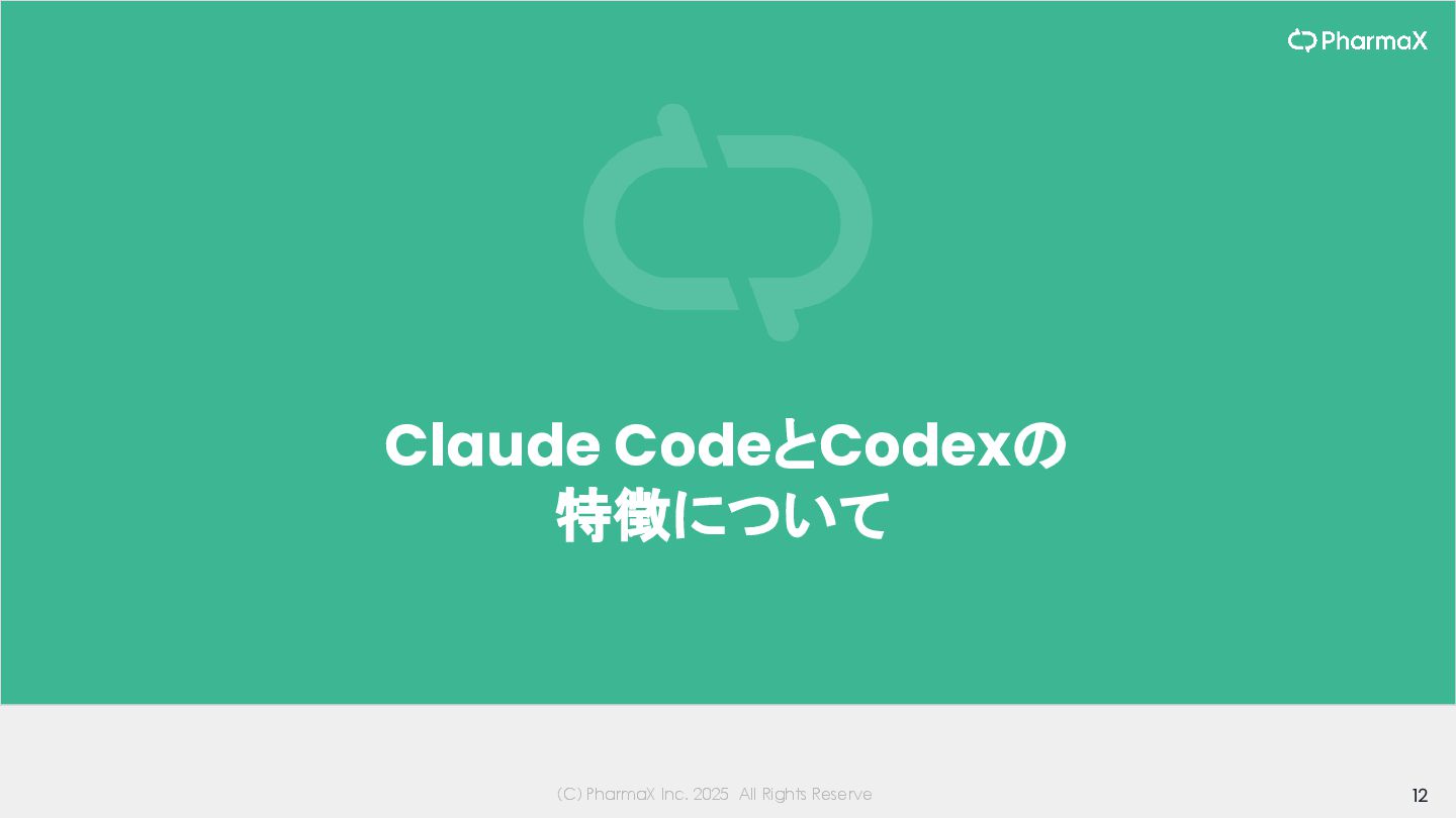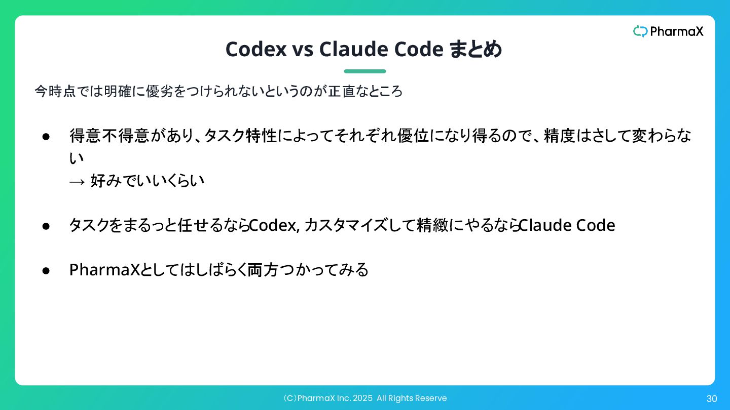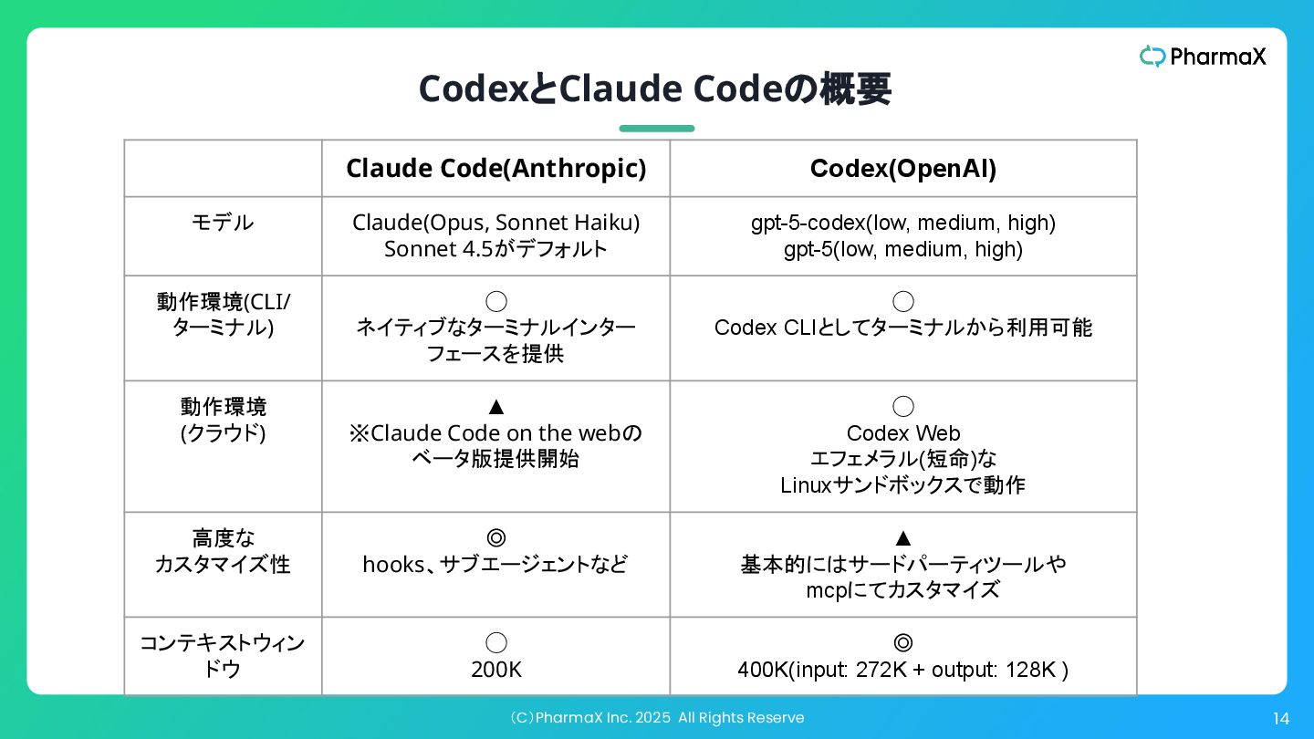 Code(Anthropic) Codex(OpenAI) モデル Claude(Opus, Sonnet Haiku) Sonnet 4.5がデフォルト gpt-5-codex(low, medium, high) gpt-5(low, medium, high) 動作環境(CLI/ ターミナル) ◯ ネイティブなターミナルインター フェースを提供 ◯ Codex CLIとしてターミナルから利用可能 動作環境 (クラウド) ▲ ※Claude Code on the webの ベータ版提供開始 ◯ Codex Web エフェメラル(短命)な Linuxサンドボックスで動作 高度な カスタマイズ性 ◎ hooks、サブエージェントなど ▲ 基本的にはサードパーティツールや mcpにてカスタマイズ コンテキストウィン ドウ ◯ 200K ◎ 400K(input: 272K + output: 128K )