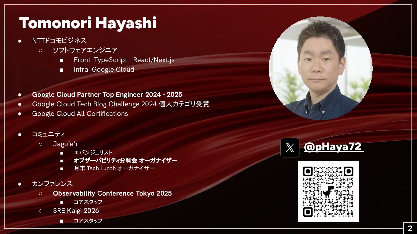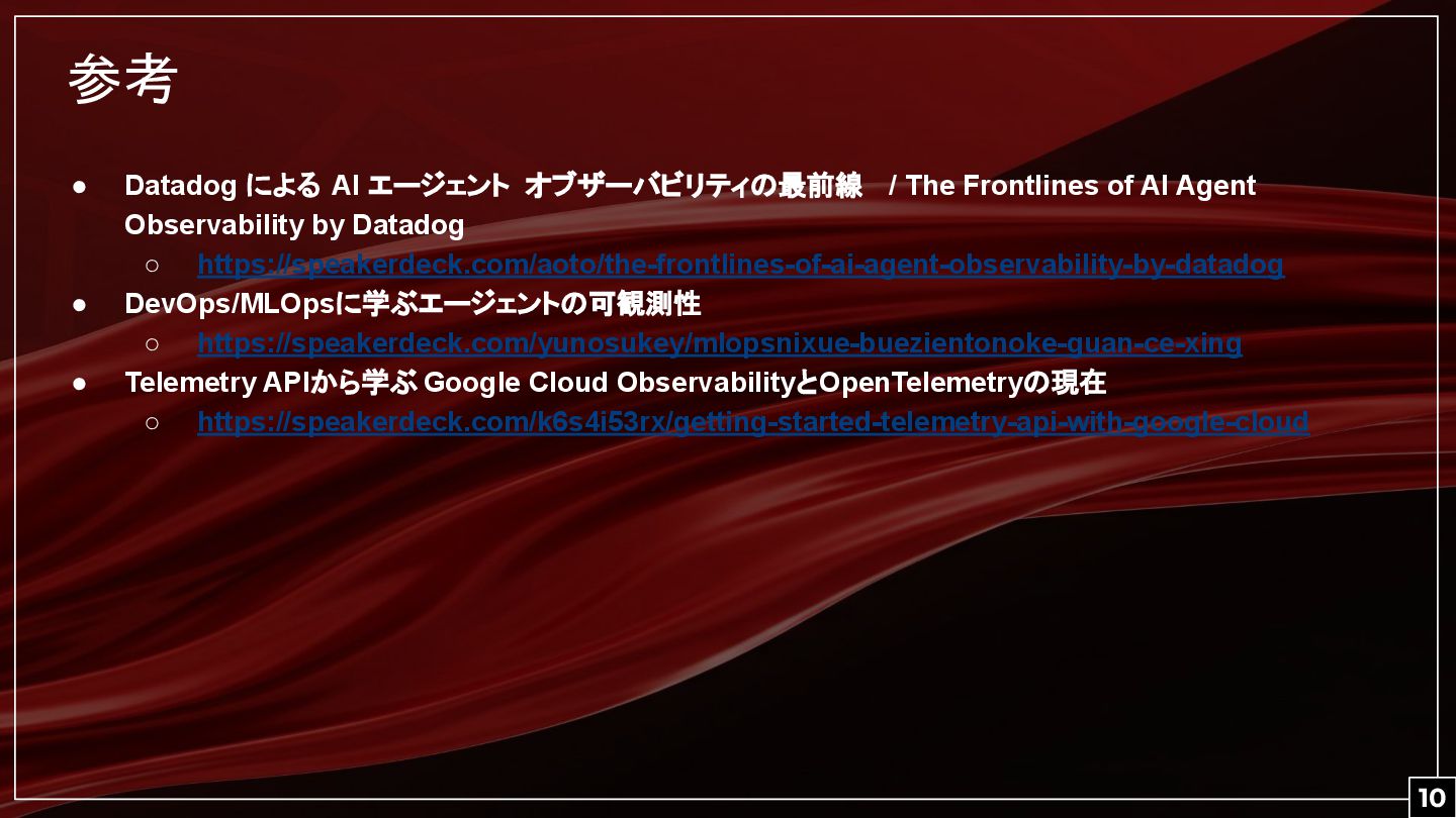 Next ‘25 Wrap Up !!」 Google Cloud Japan Mori-san, Nakane-san Shigeru-san 18:45 - Community Member LT-1「振り返りと気になったセッション」 DocoTech Kanzaki-san 18:55 - Guest LT-1「A2A のドキュメントソースコードを読んでみた」 DII Yamazaki-san 19:05 - Guest LT-2「GKEラウンドテーブルと気になったセッションの振り返り」 Docomo Toe-san 19:15 - Community Member LT-2「ワークロードの規模でみる Cloud Run のアーキテクチャ」 Com Hayashi-san 19:30 - Community Member LT-3「振り返りと気になったセッション」 Docomo Fujihira-san, Yano-san 19:45 - Closing 参考 • Datadog による AI エージェント オブザーバビリティの最前線 / The Frontlines of AI Agent Observability by Datadog ◦ https://speakerdeck.com/aoto/the-frontlines-of-ai-agent-observability-by-datadog • DevOps/MLOpsに学ぶエージェントの可観測性 ◦ https://speakerdeck.com/yunosukey/mlopsnixue-buezientonoke-guan-ce-xing • Telemetry APIから学ぶ Google Cloud ObservabilityとOpenTelemetryの現在 ◦ https://speakerdeck.com/k6s4i53rx/getting-started-telemetry-api-with-google-cloud 11