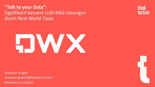 , -0.13498 , -0.08813 , 0.47377 , -0.61798 , -0.31012 , -0.076666, 1.493 , -0.034189, -0.98173 , 0.68229 , 0.81722 , -0.51874 , -0.31503 , -0.55809 , 0.66421 , 0.1961 , -0.13495 , -0.11476 , -0.30344 , 0.41177 , -2.223 , -1.0756 , -1.0783 , -0.34354 , 0.33505 , 1.9927 , -0.04234 , -0.64319 , 0.71125 , 0.49159 , 0.16754 , 0.34344 , -0.25663 , -0.8523 , 0.1661 , 0.40102 , 1.1685 , -1.0137 , -0.21585 , -0.15155 , 0.78321 , -0.91241 , -1.6106 , -0.64426 , -0.51042 ] Embedding-Model http://jalammar.github.io/illustrated-word2vec/ Signifikant bessere LLM-RAG-Lösungen durch Real-World Tipps "Talk to your data":