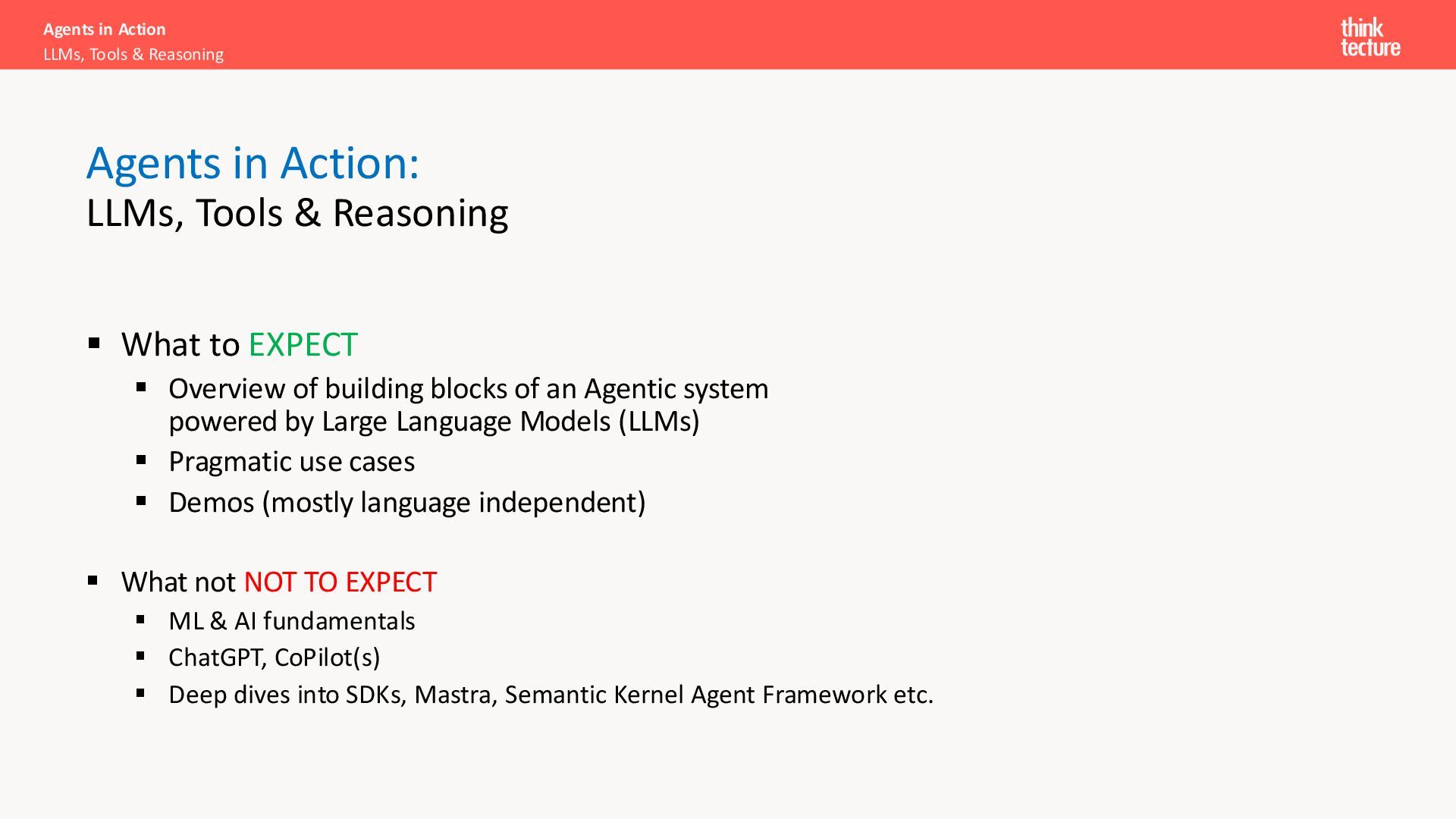 an Agentic system powered by Large Language Models (LLMs) ▪ Pragmatic use cases ▪ Demos (mostly language independent) ▪ What not NOT TO EXPECT ▪ ML & AI fundamentals ▪ ChatGPT, CoPilot(s) ▪ Deep dives into SDKs, Mastra, Semantic Kernel Agent Framework etc. Agents in Action LLMs, Tools & Reasoning Agents in Action: LLMs, Tools & Reasoning