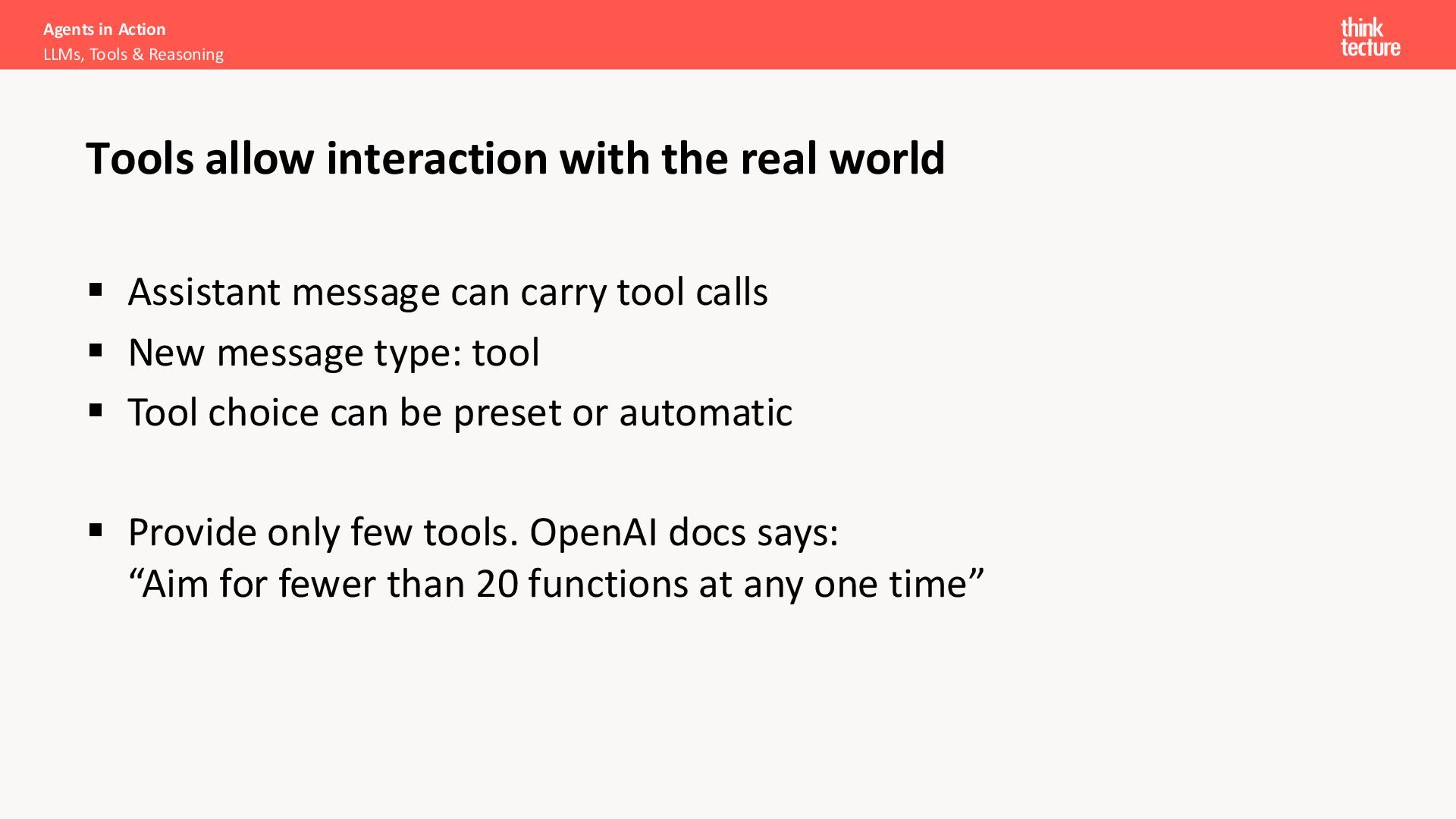 with the real world ▪ Assistant message can carry tool calls ▪ New message type: tool ▪ Tool choice can be preset or automatic ▪ Provide only few tools. OpenAI docs says: “Aim for fewer than 20 functions at any one time”