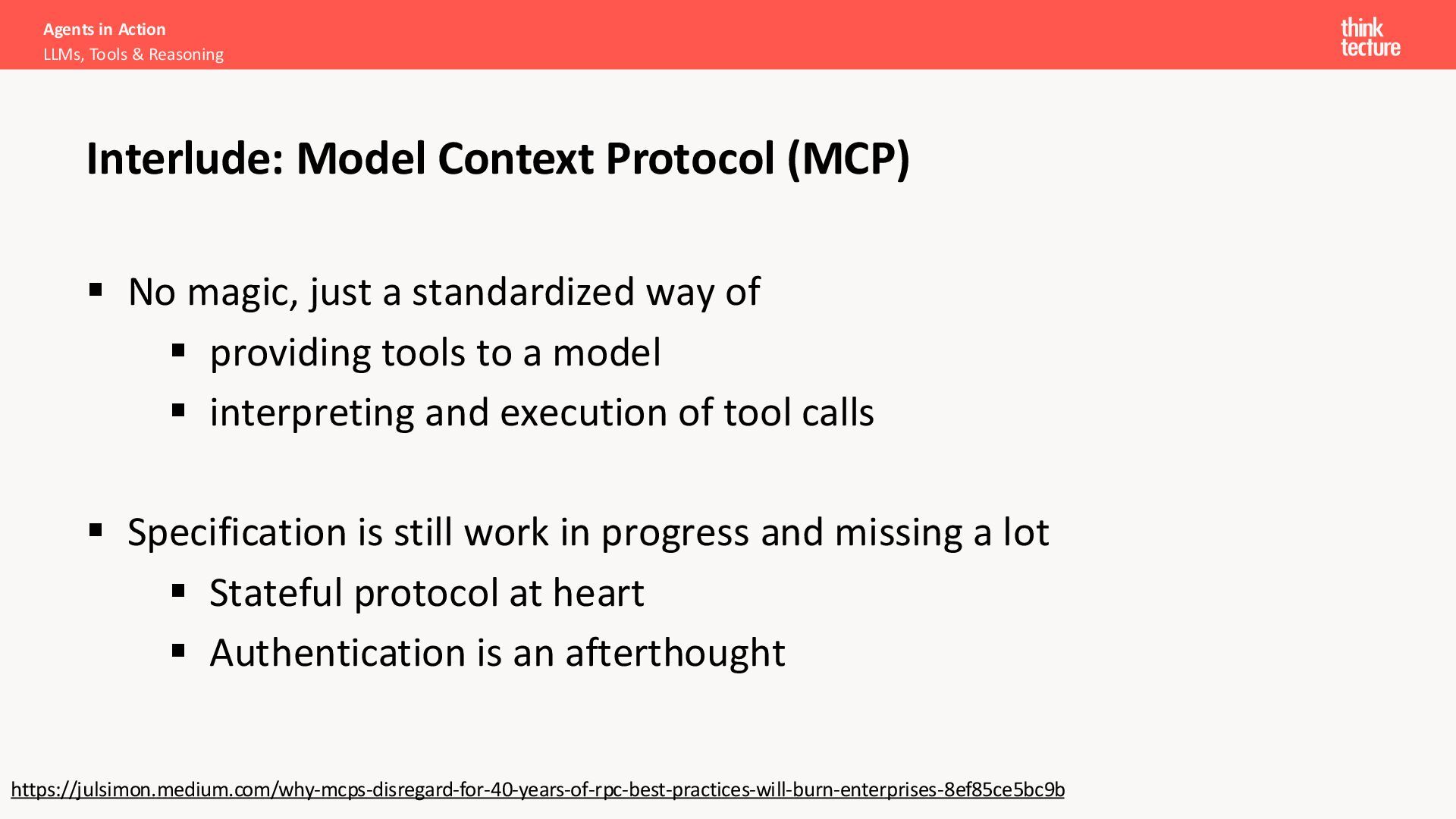 Protocol (MCP) ▪ No magic, just a standardized way of ▪ providing tools to a model ▪ interpreting and execution of tool calls ▪ Specification is still work in progress and missing a lot ▪ Stateful protocol at heart ▪ Authentication is an afterthought https://julsimon.medium.com/why-mcps-disregard-for-40-years-of-rpc-best-practices-will-burn-enterprises-8ef85ce5bc9b