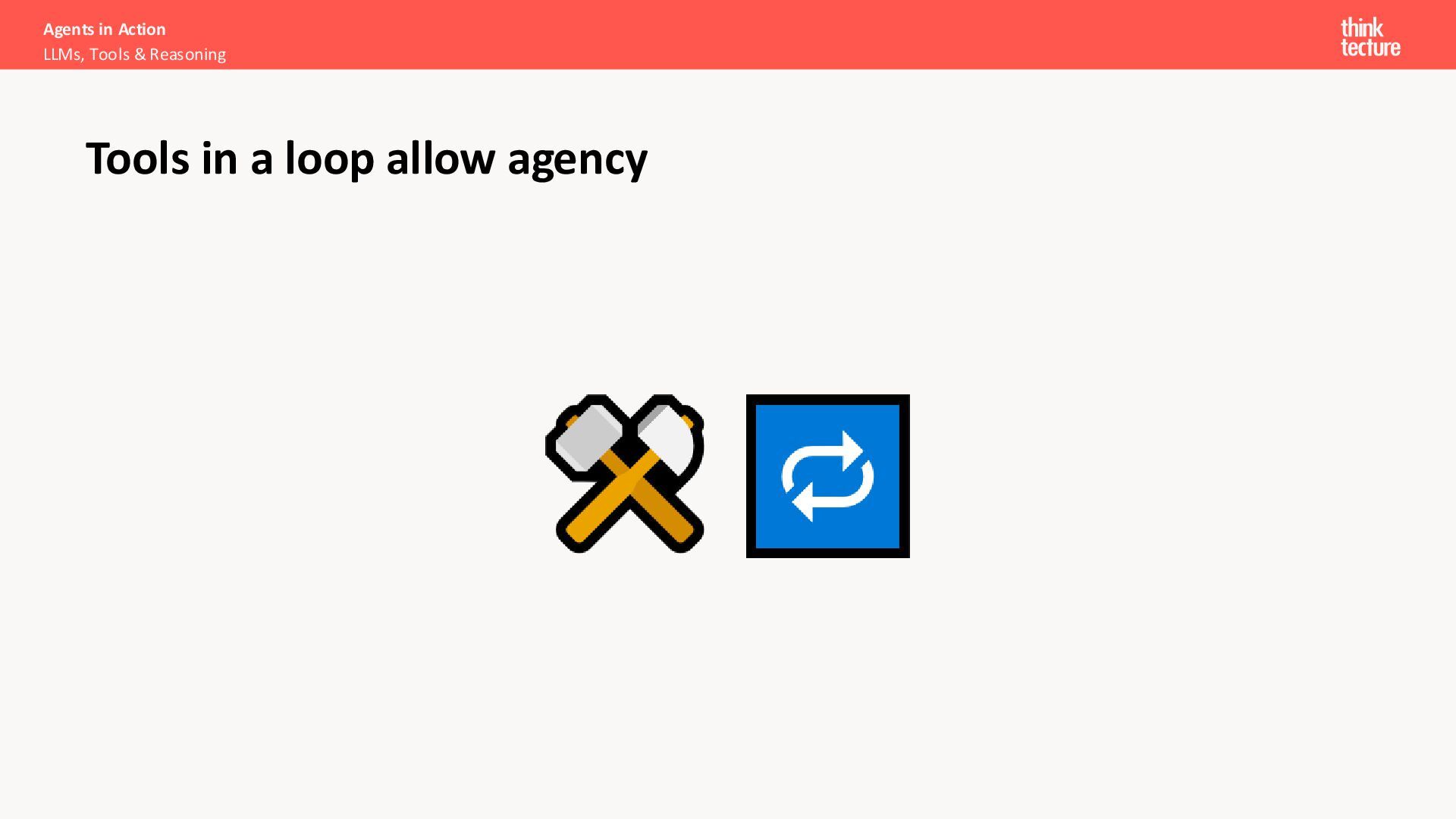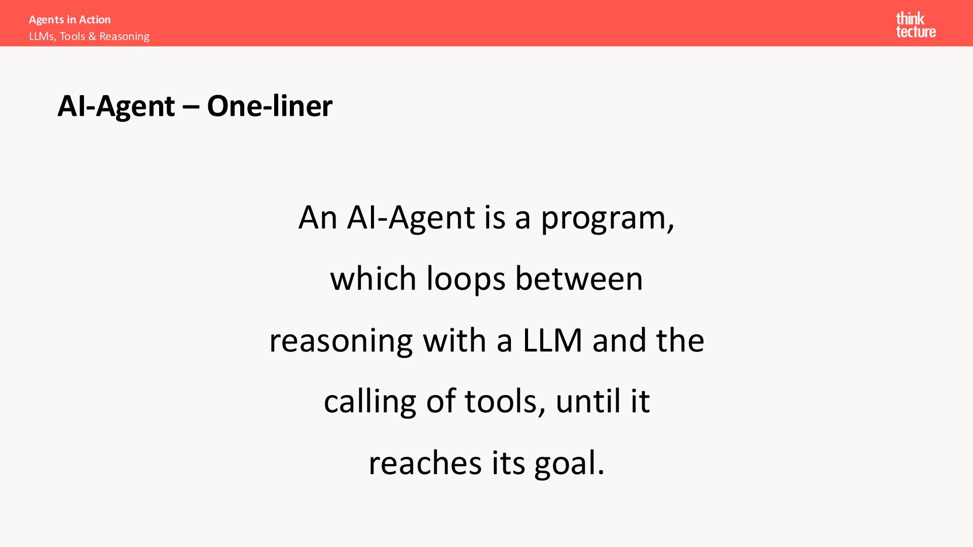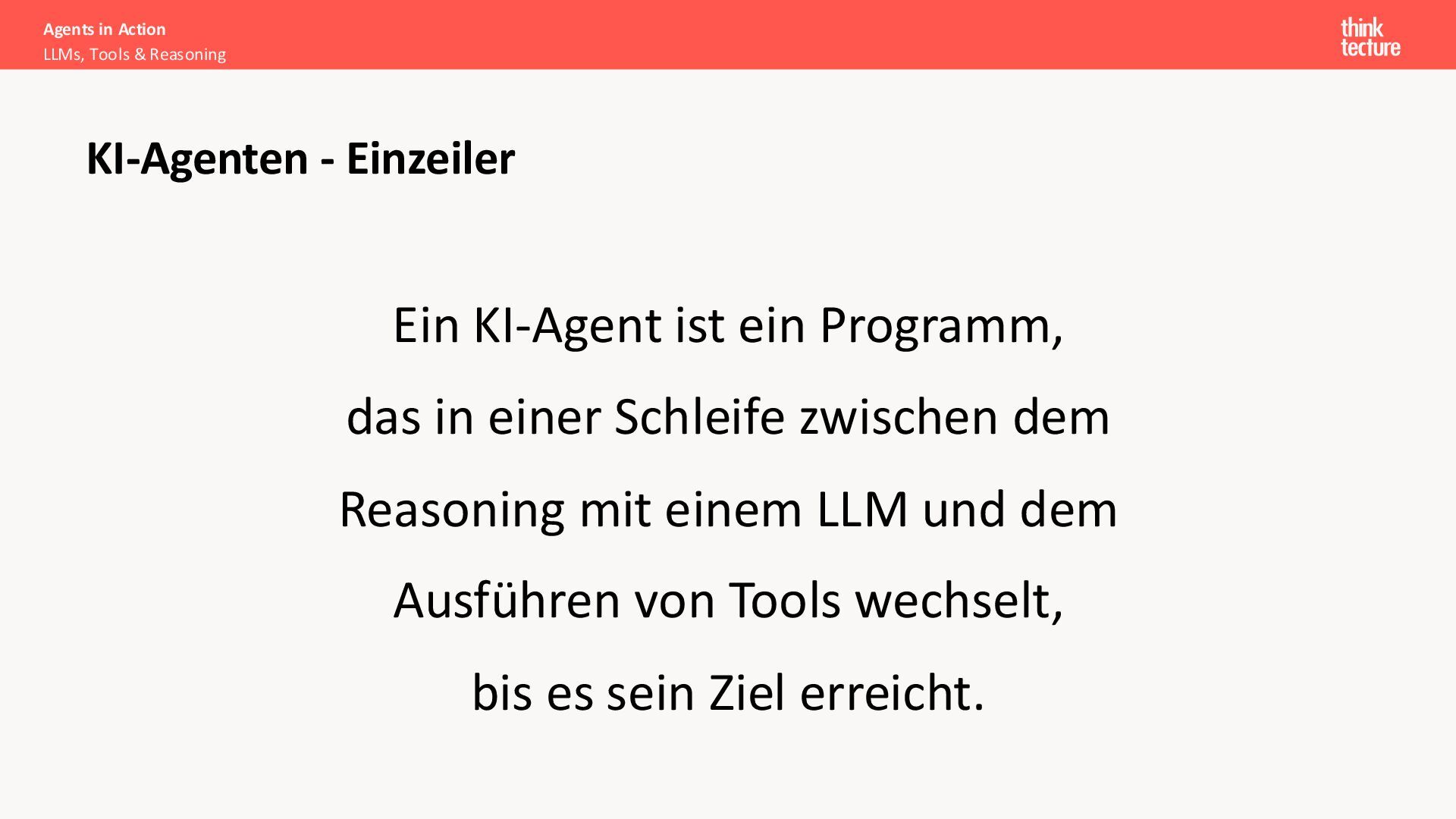 dem Reasoning mit einem LLM und dem Ausführen von Tools wechselt, bis es sein Ziel erreicht. Agents in Action LLMs, Tools & Reasoning KI-Agenten - Einzeiler