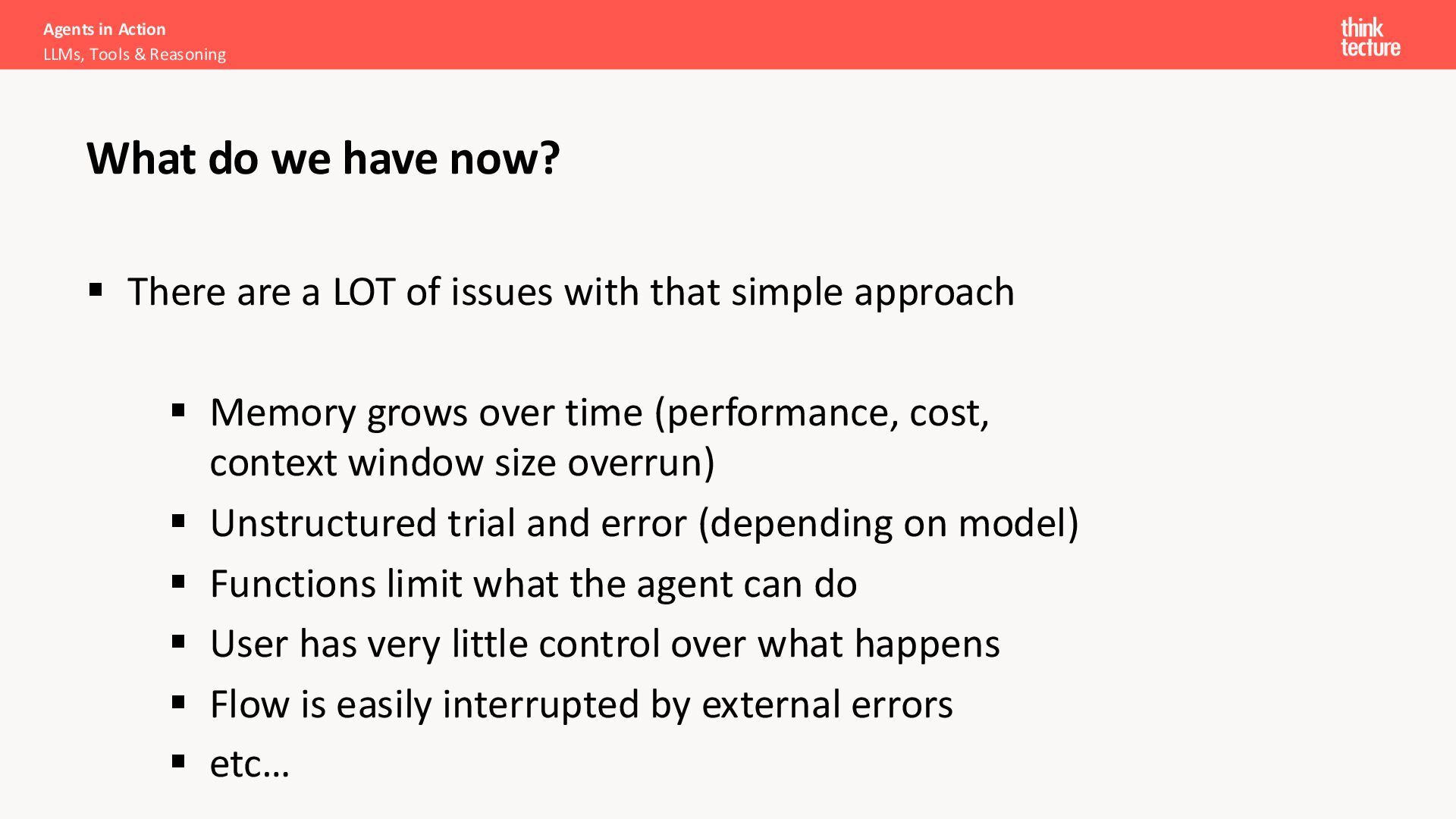 have now? ▪ There are a LOT of issues with that simple approach ▪ Memory grows over time (performance, cost, context window size overrun) ▪ Unstructured trial and error (depending on model) ▪ Functions limit what the agent can do ▪ User has very little control over what happens ▪ Flow is easily interrupted by external errors ▪ etc…