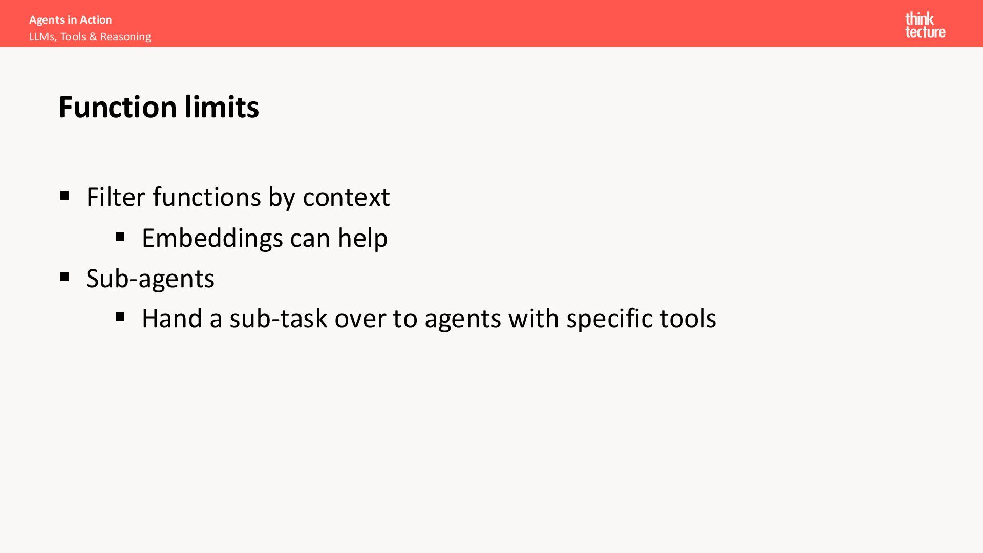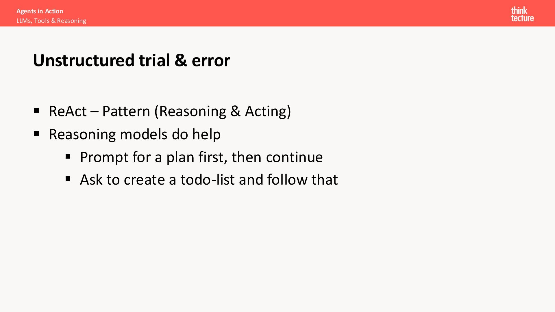 error ▪ ReAct – Pattern (Reasoning & Acting) ▪ Reasoning models do help ▪ Prompt for a plan first, then continue ▪ Ask to create a todo-list and follow that