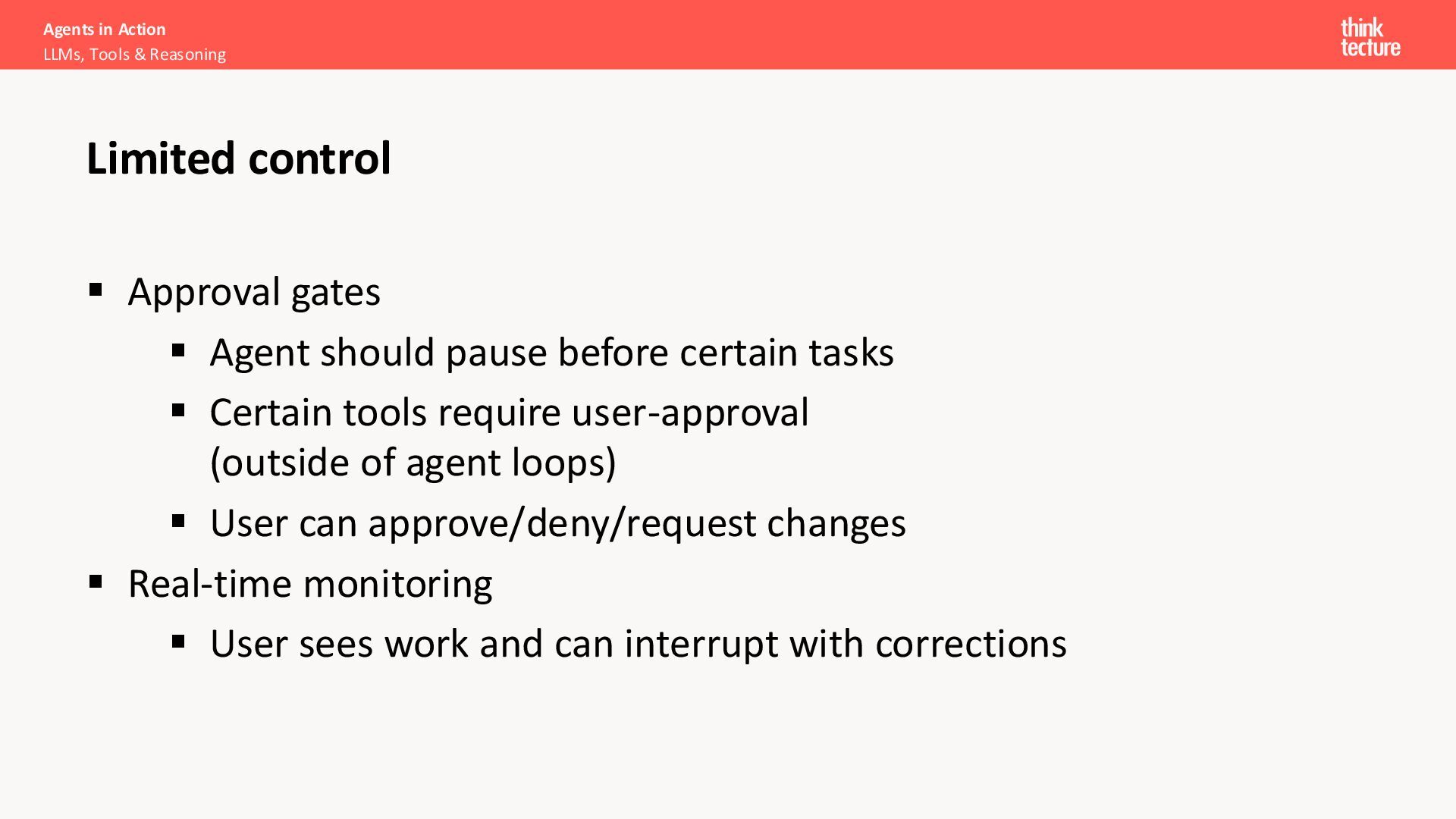 Approval gates ▪ Agent should pause before certain tasks ▪ Certain tools require user-approval (outside of agent loops) ▪ User can approve/deny/request changes ▪ Real-time monitoring ▪ User sees work and can interrupt with corrections