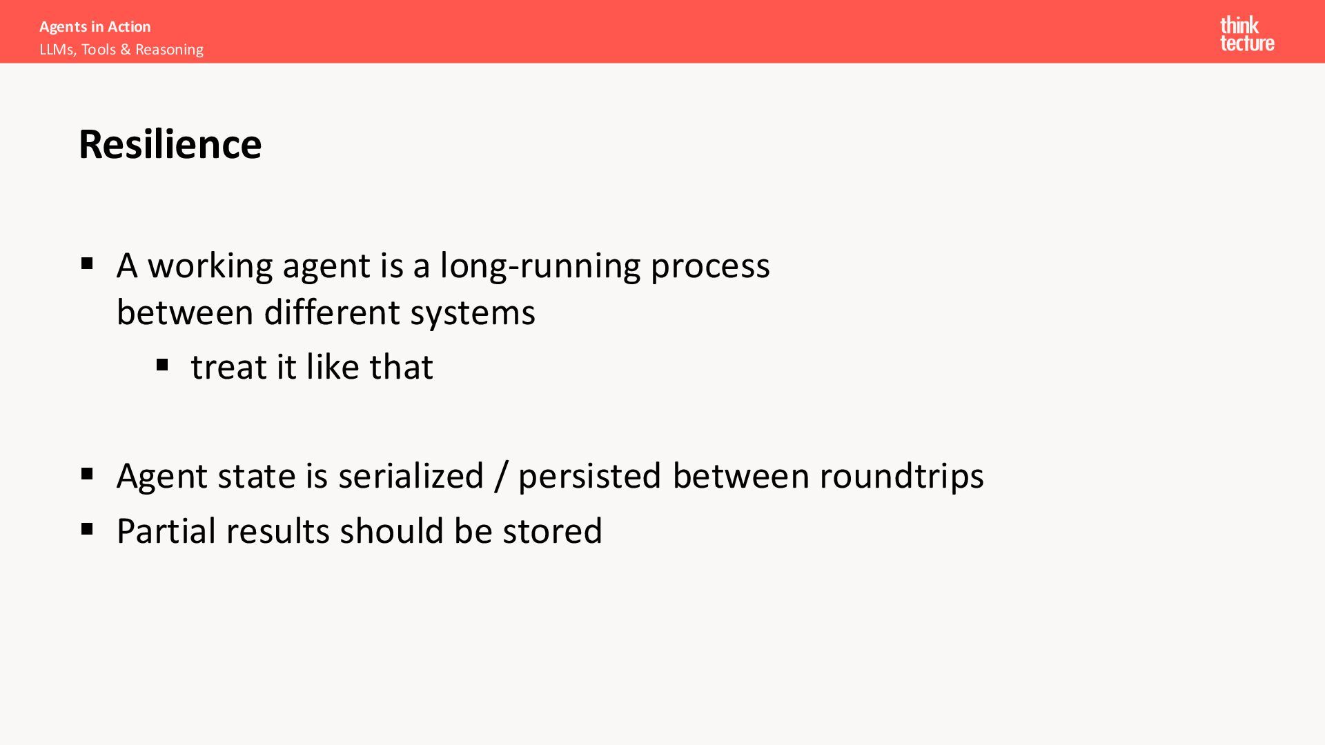 working agent is a long-running process between different systems ▪ treat it like that ▪ Agent state is serialized / persisted between roundtrips ▪ Partial results should be stored