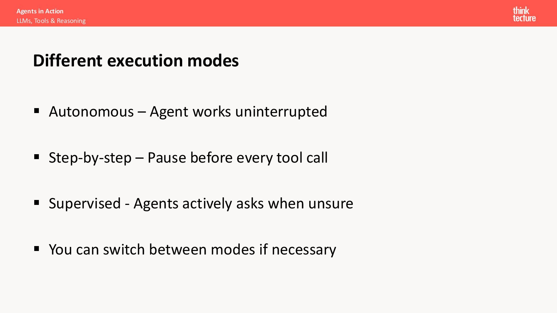▪ Autonomous – Agent works uninterrupted ▪ Step-by-step – Pause before every tool call ▪ Supervised - Agents actively asks when unsure ▪ You can switch between modes if necessary