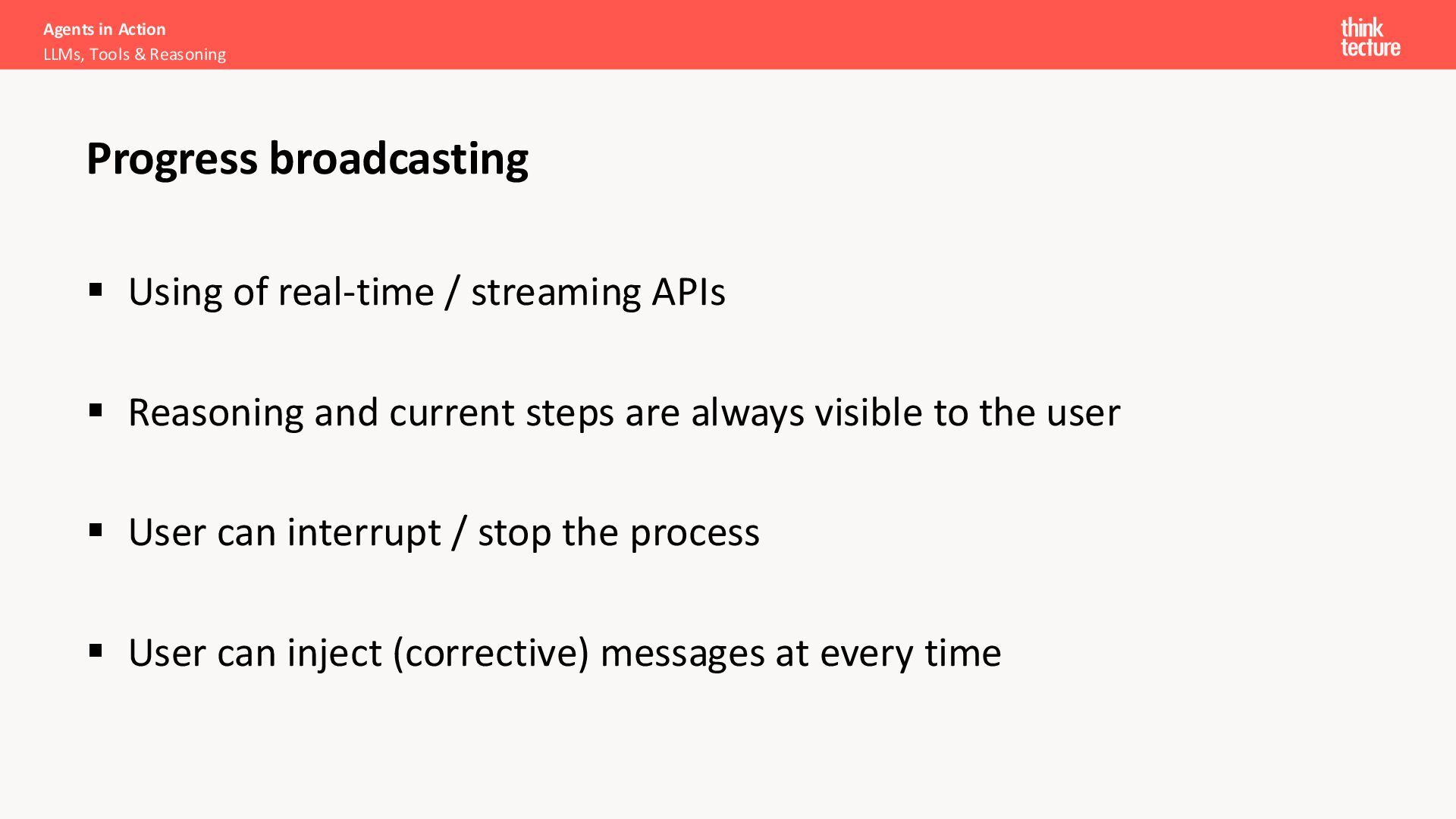 Using of real-time / streaming APIs ▪ Reasoning and current steps are always visible to the user ▪ User can interrupt / stop the process ▪ User can inject (corrective) messages at every time