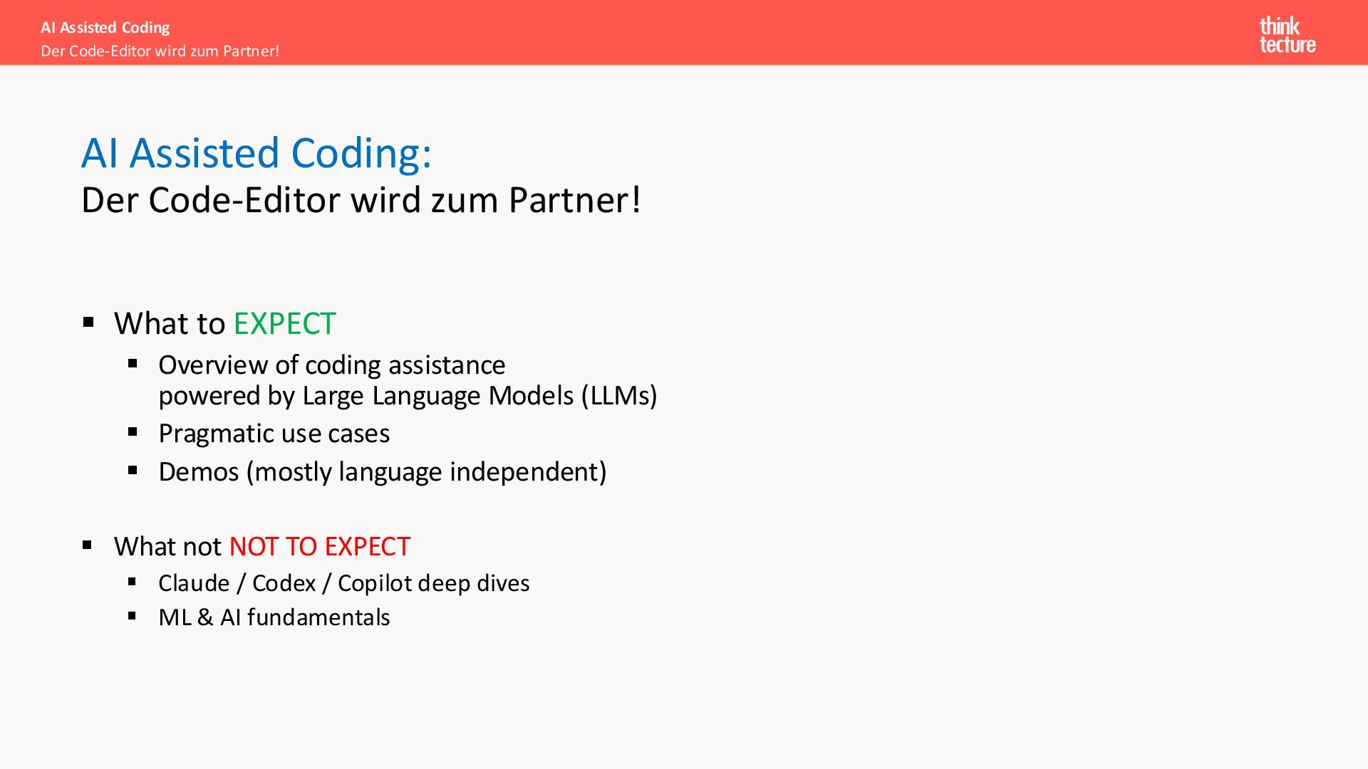 by Large Language Models (LLMs) ▪ Pragmatic use cases ▪ Demos (mostly language independent) ▪ What not NOT TO EXPECT ▪ Claude / Codex / Copilot deep dives ▪ ML & AI fundamentals AI Assisted Coding: Der Code-Editor wird zum Partner! Der Code-Editor wird zum Partner! AI Assisted Coding