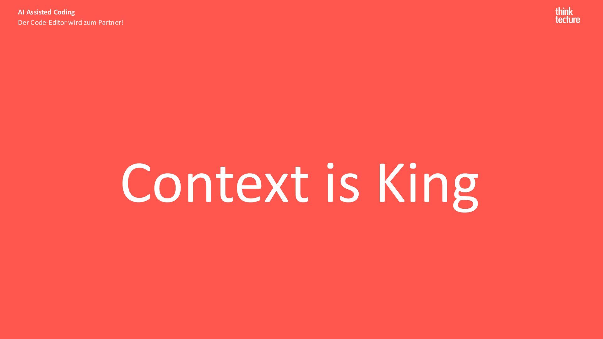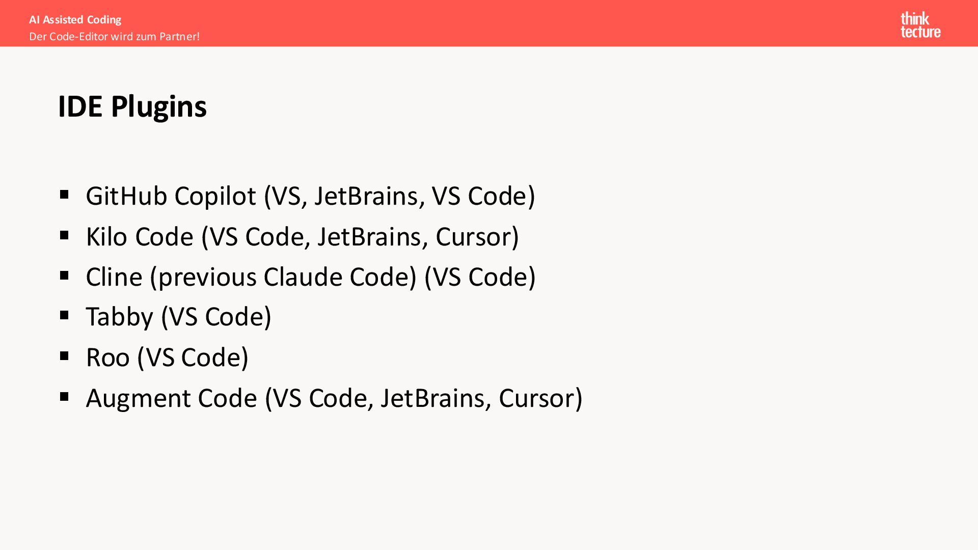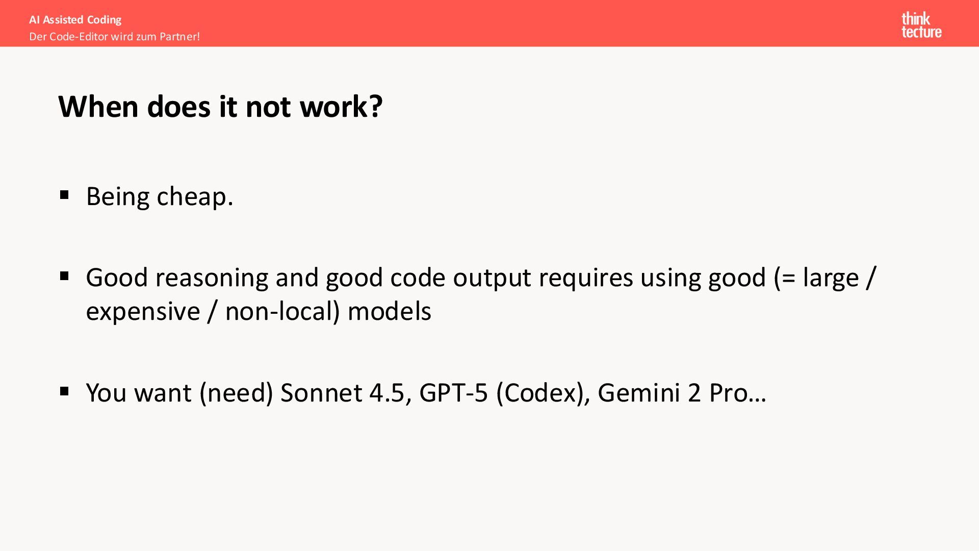 reasoning and good code output requires using good (= large / expensive / non-local) models ▪ You want (need) Sonnet 4.5, GPT-5 (Codex), Gemini 2 Pro… Der Code-Editor wird zum Partner! AI Assisted Coding