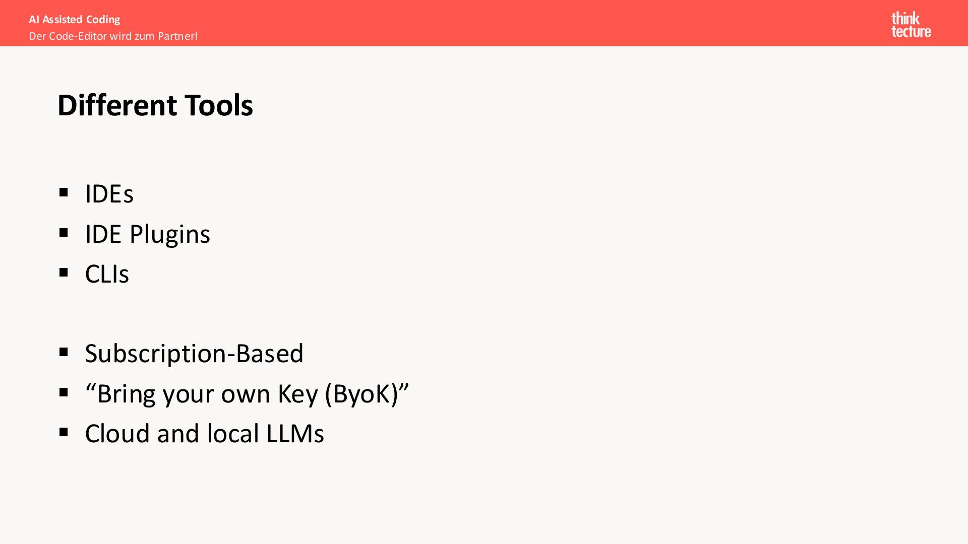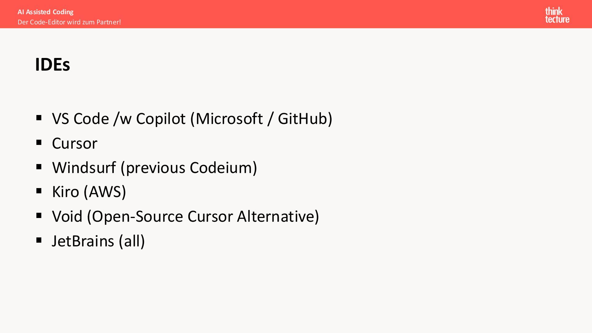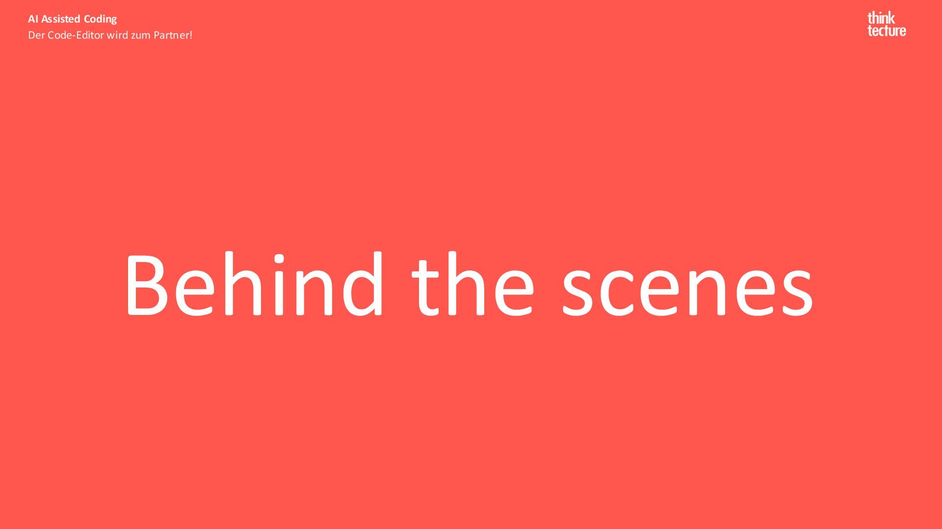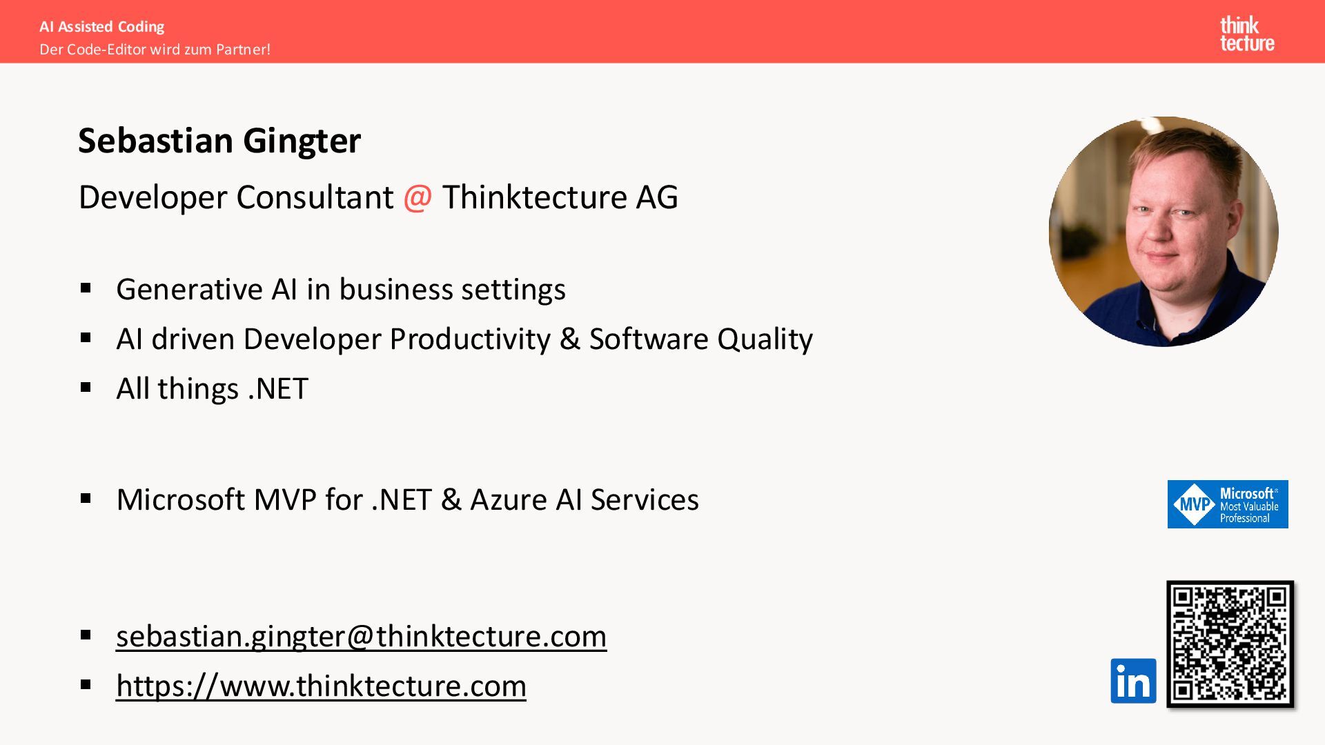 Productivity & Software Quality ▪ All things .NET ▪ Microsoft MVP for .NET & Azure AI Services ▪ [email protected] ▪ https://www.thinktecture.com Sebastian Gingter Developer Consultant @ Thinktecture AG Der Code-Editor wird zum Partner! AI Assisted Coding