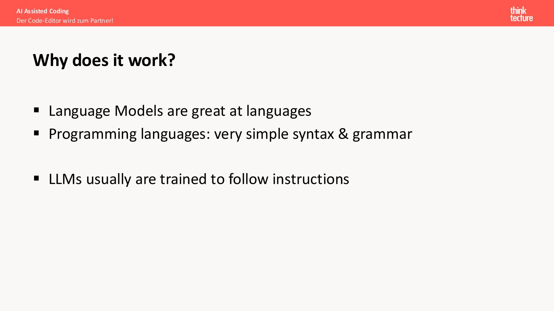 languages ▪ Programming languages: very simple syntax & grammar ▪ LLMs usually are trained to follow instructions Der Code-Editor wird zum Partner! AI Assisted Coding