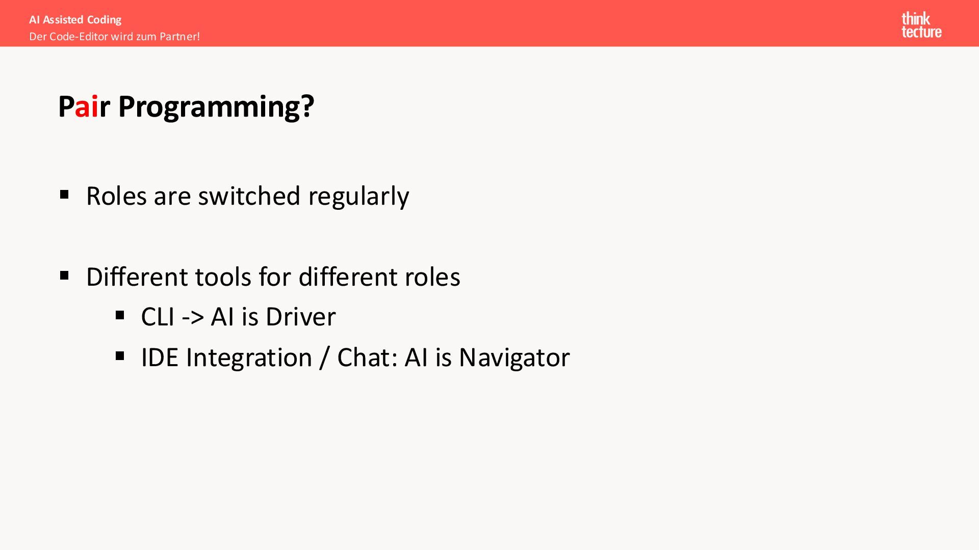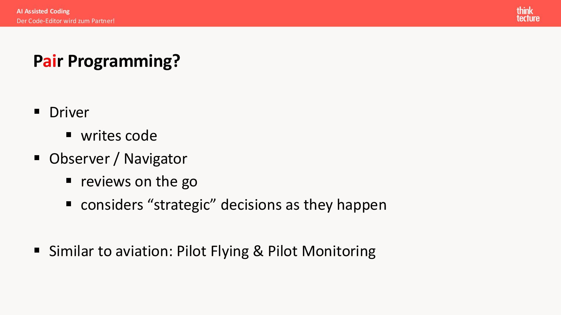 Navigator ▪ reviews on the go ▪ considers “strategic” decisions as they happen ▪ Similar to aviation: Pilot Flying & Pilot Monitoring Der Code-Editor wird zum Partner! AI Assisted Coding