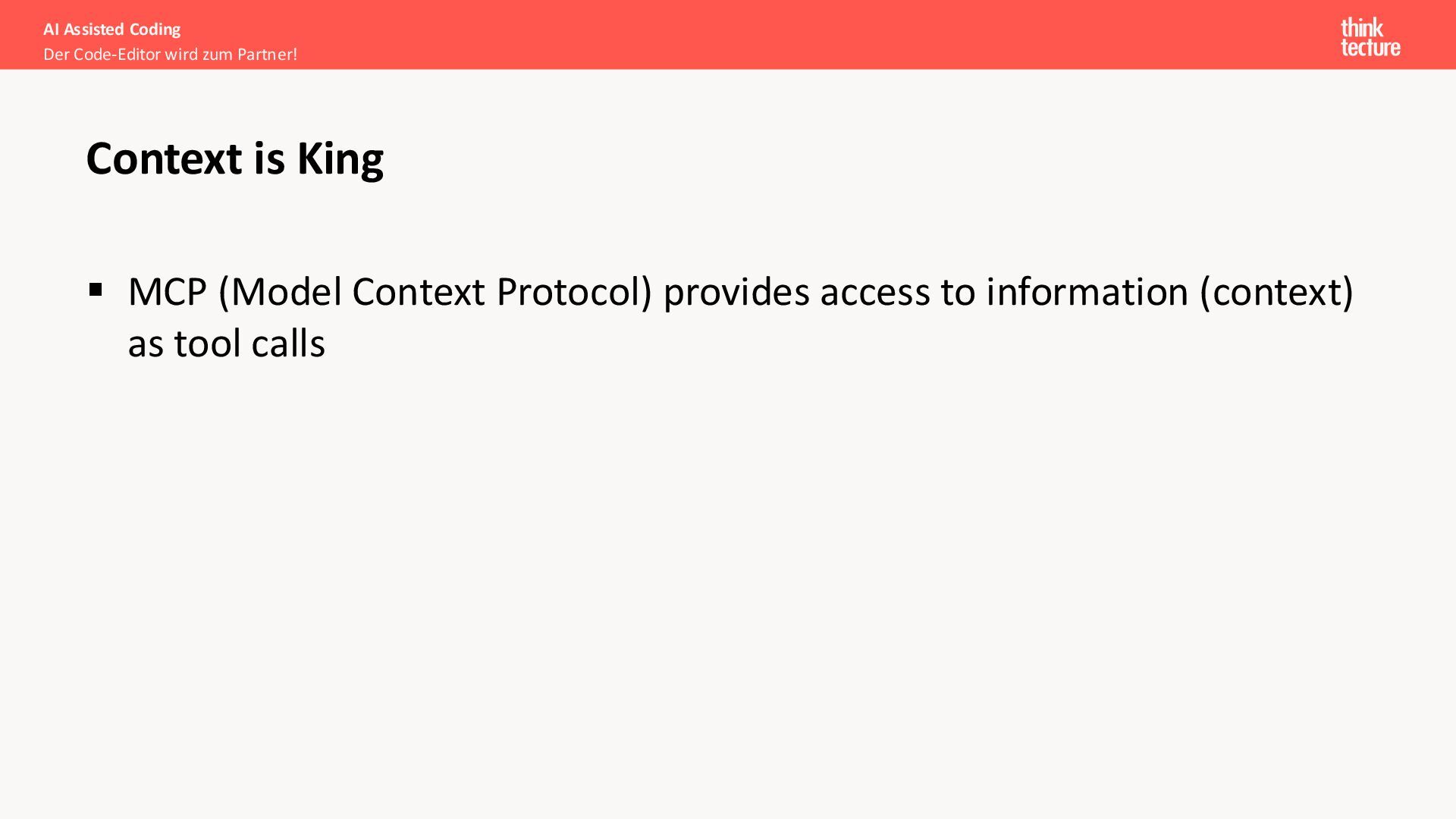CLAUDE.md, Contributing.md etc. ▪ Memory ▪ Tasks, Todos, Guidelines etc. need to be memorized ▪ Dependencies ▪ Model needs to know the APIs or else… ▪ it can / will hallucinate calls https://github.com/josix/awesome-claude-md Der Code-Editor wird zum Partner! AI Assisted Coding
