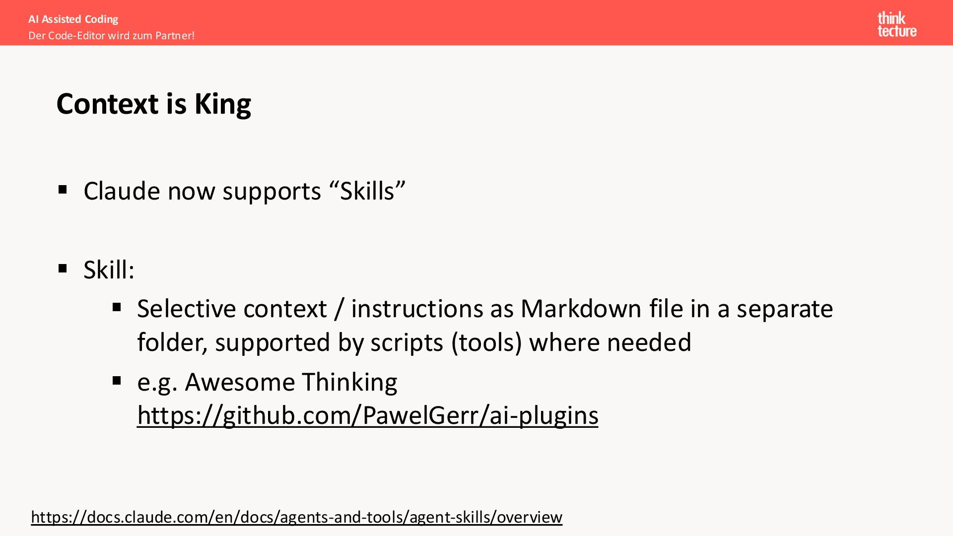 ▪ Selective context / instructions as Markdown file in a separate folder, supported by scripts (tools) where needed ▪ e.g. Awesome Thinking https://github.com/PawelGerr/ai-plugins https://docs.claude.com/en/docs/agents-and-tools/agent-skills/overview Der Code-Editor wird zum Partner! AI Assisted Coding