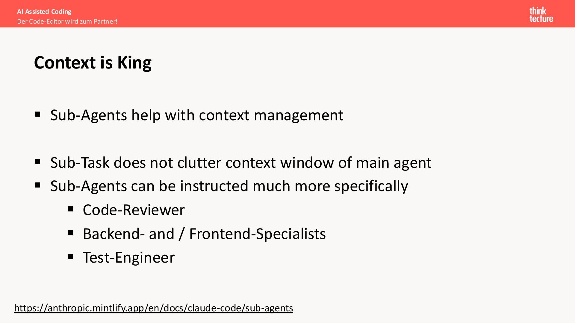 Sub-Task does not clutter context window of main agent ▪ Sub-Agents can be instructed much more specifically ▪ Code-Reviewer ▪ Backend- and / Frontend-Specialists ▪ Test-Engineer https://anthropic.mintlify.app/en/docs/claude-code/sub-agents Der Code-Editor wird zum Partner! AI Assisted Coding
