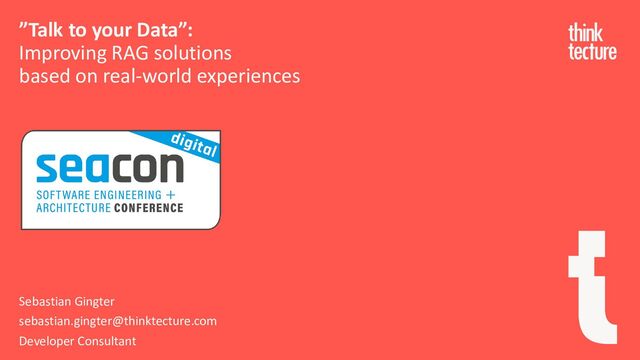 scalable backends ▪ All things .NET ▪ Pragmatic end-to-end architectures ▪ Developer productivity ▪ Software quality [email protected] @phoenixhawk https://www.thinktecture.com Sebastian Gingter Developer Consultant @ Thinktecture AG "Talk to your Data": Improving RAG solutions based on real-world experiences
