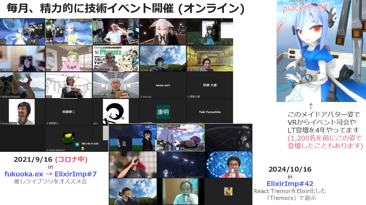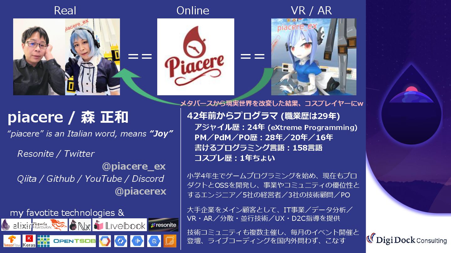/ AR my favotite technologies & implements Resonite / Twitter @piacere_ex Qiita / Github / YouTube / Discord @piacerex 42年前からプログラマ (職業歴は29年) アジャイル歴:24年 (eXtreme Programming) PM/PdM/PO歴:28年/20年/16年 書けるプログラミング言語:158言語 コスプレ歴:1年ちょい 小学4年生でゲームプログラミングを始め、現在もプロ ダクトとOSSを開発し、事業やコミュニティの優位性と するエンジニア/5社の経営者/3社の技術顧問/PO 大手企業をメイン顧客として、IT事業/データ分析/ VR・AR/分散・並行技術/UX・D2C指導を提供 技術コミュニティも複数主催し、毎月のイベント開催と 登壇、ライブコーディングを国内外問わず、こなす piacere / 森 正和 “piacere” is an Italian word, means “Joy” メタバースから現実世界を改変した結果、コスプレイヤーにw