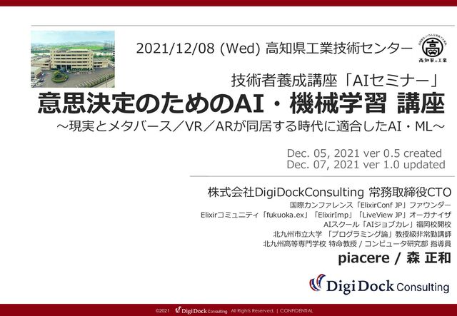 技術者養成講座「AIセミナー」 意思決定のためのAI・機械学習 講座 ~現実とメタバース/VR/ARが同居する時代に適合したAI・ML~ Dec. 05, 2021 ver 0.5 created. Dec. 07, 2021 ver 1.0 updated 株式会社DigiDockConsulting 常務取締役CTO 国際カンファレンス「ElixirConf JP」ファウンダー Elixirコミュニティ「fukuoka.ex」「ElixirImp」「LiveView JP」オーガナイザ AIスクール「AIジョブカレ」福岡校開校 北九州市立大学 「プログラミング論」教授級非常勤講師 北九州高等専門学校 特命教授 / コンピュータ研究部 指導員 piacere / 森 正和