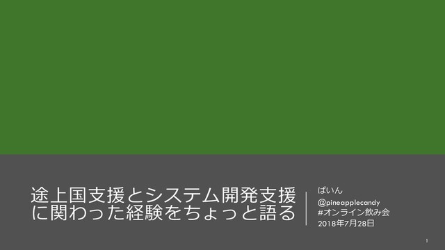 途上国支援とシステム開発支援 に関わった経験をちょっと語る ぱいん @pineapplecandy #オンライン飲み会 2018年7月28日 1