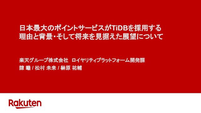 本スライドでは、TiDBを選択するに至った経緯と、TiDBを用いたシステムの将来的な展望について説明します。