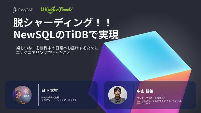 2023年8月に開催されたイベント「CEDEC 2023」でのWonderPlanet社とPingCAPによるセッション「脱シャーディング!! NewSQLのTiDBで実現 ~ 楽しいね!を世界中の日常へお届けするためにエンジニアリングで行ったこと」の資料です。