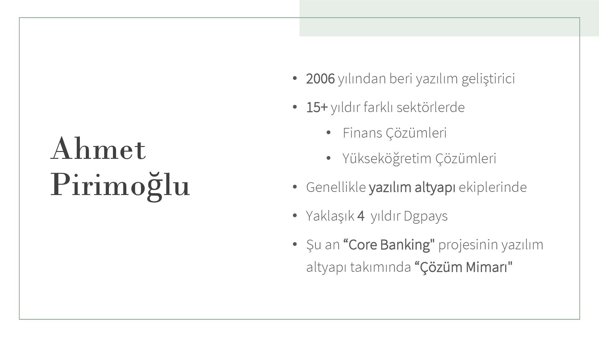 yıldır farklı sektörlerde • Finans Çözümleri • Yükseköğretim Çözümleri • Genellikle yazılım altyapı ekiplerinde • Yaklaşık 4 yıldır Dgpays • Şu an “Core Banking" projesinin yazılım altyapı takımında “Çözüm Mimarı"