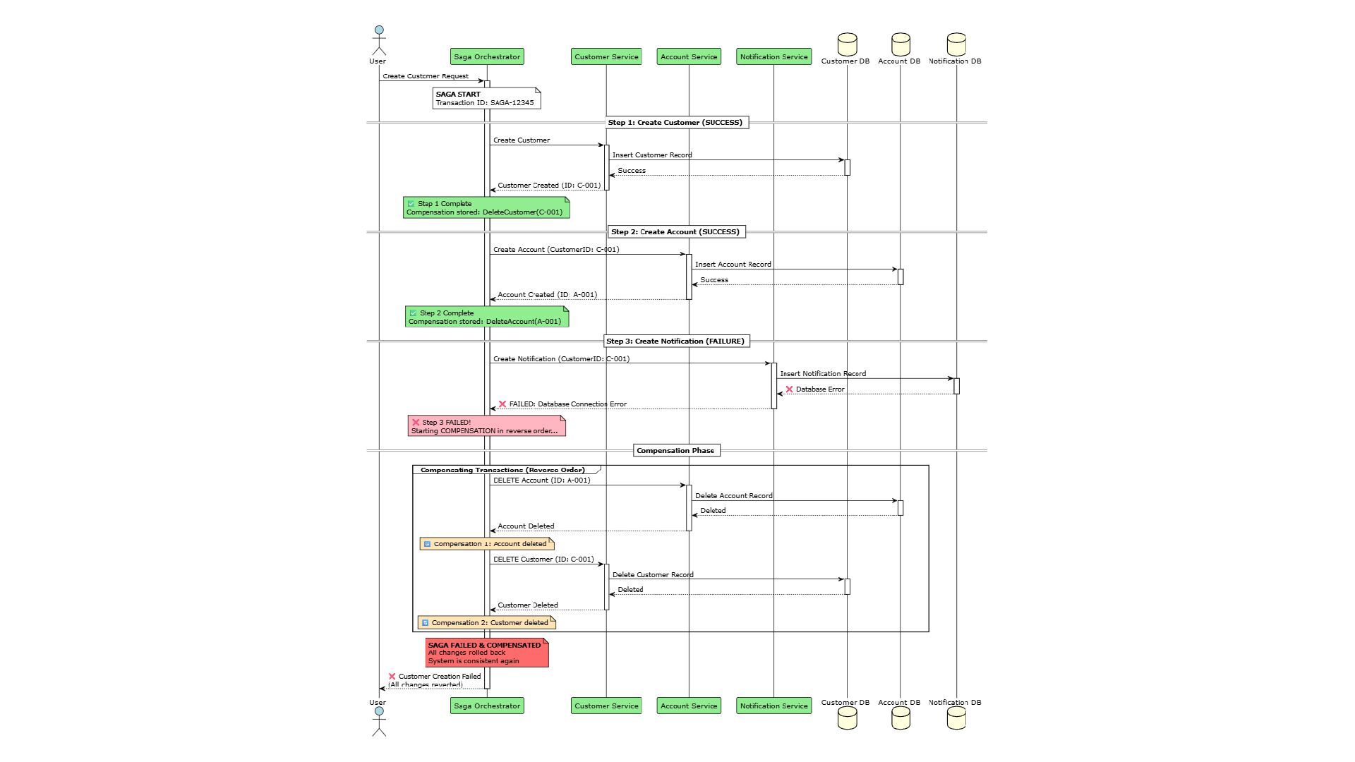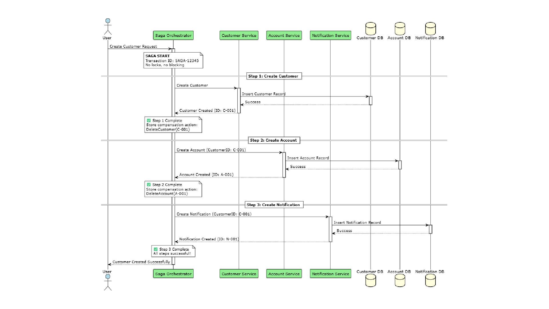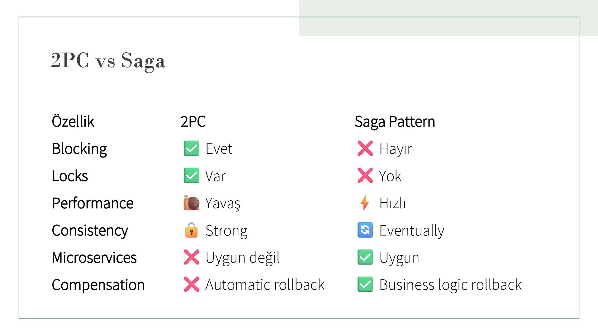 Locks Var Yok Performance Yavaş Hızlı Consistency Strong Eventually Microservices Uygun değil Uygun Compensation Automatic rollback Business logic rollback