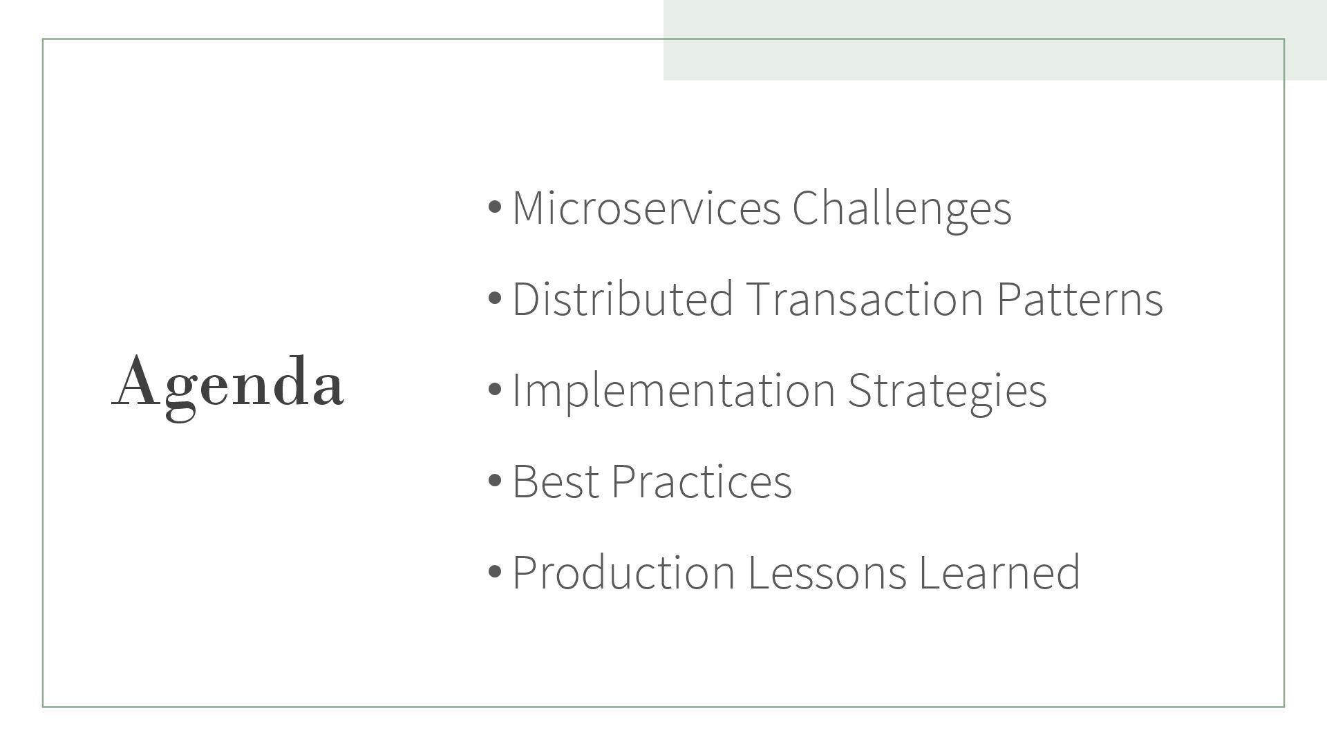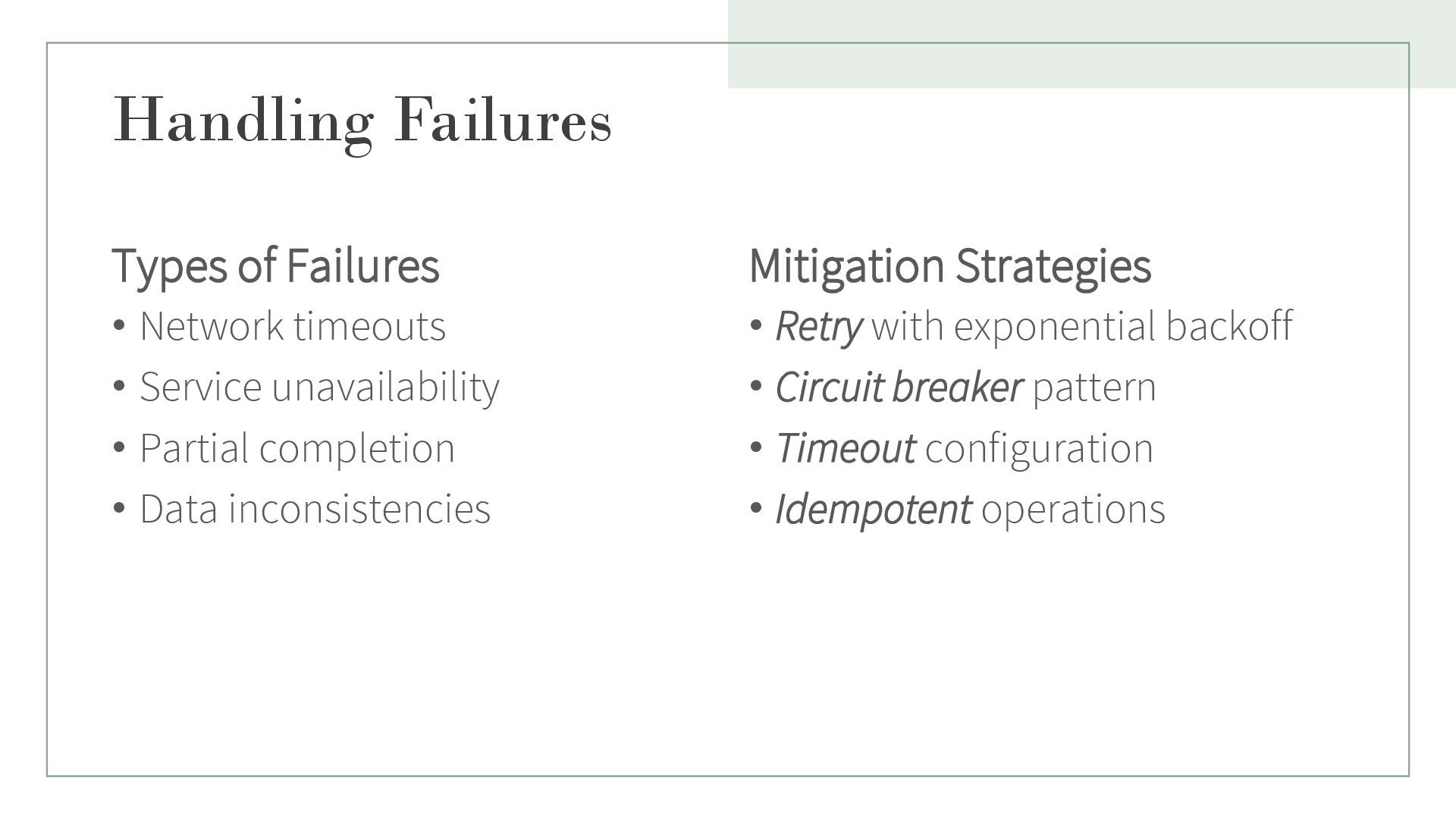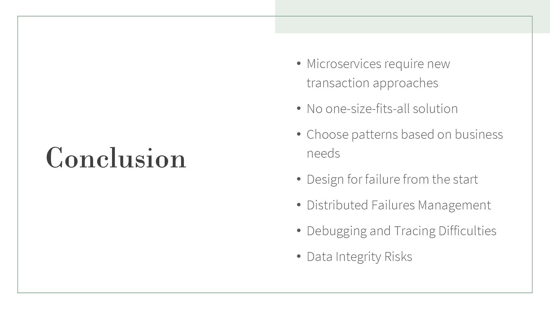 solution • Choose patterns based on business needs • Design for failure from the start • Distributed Failures Management • Debugging and Tracing Difficulties • Data Integrity Risks