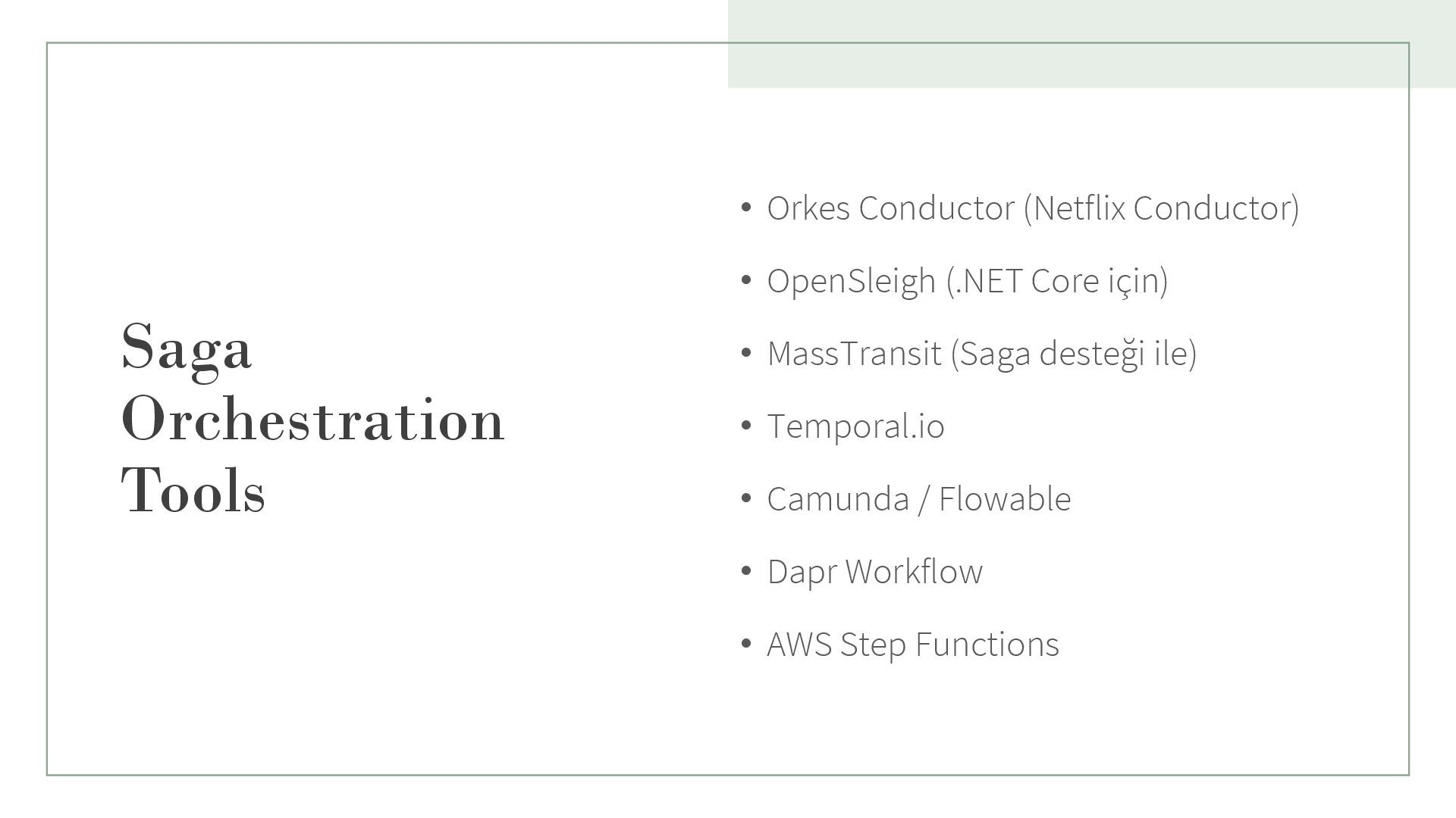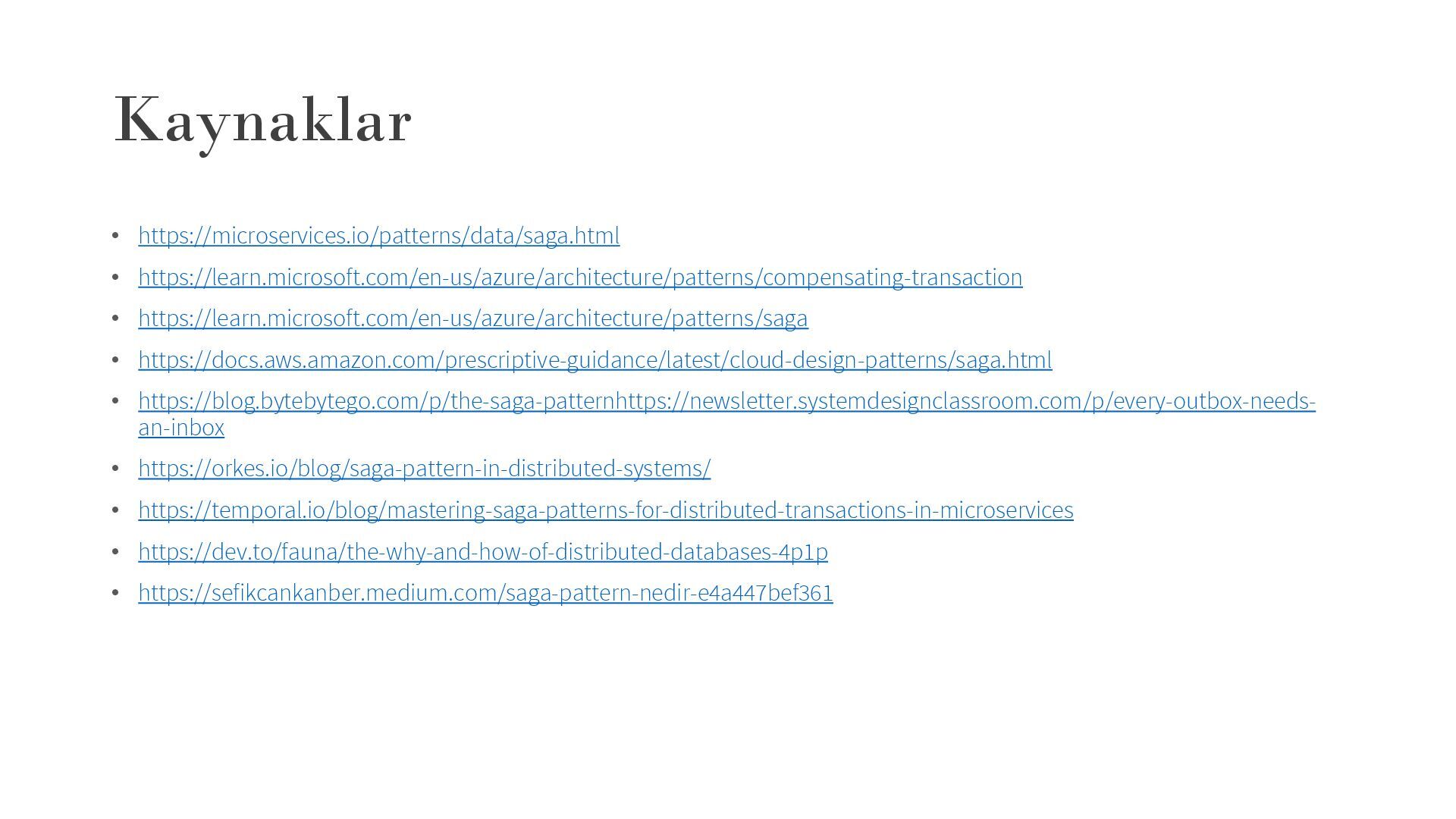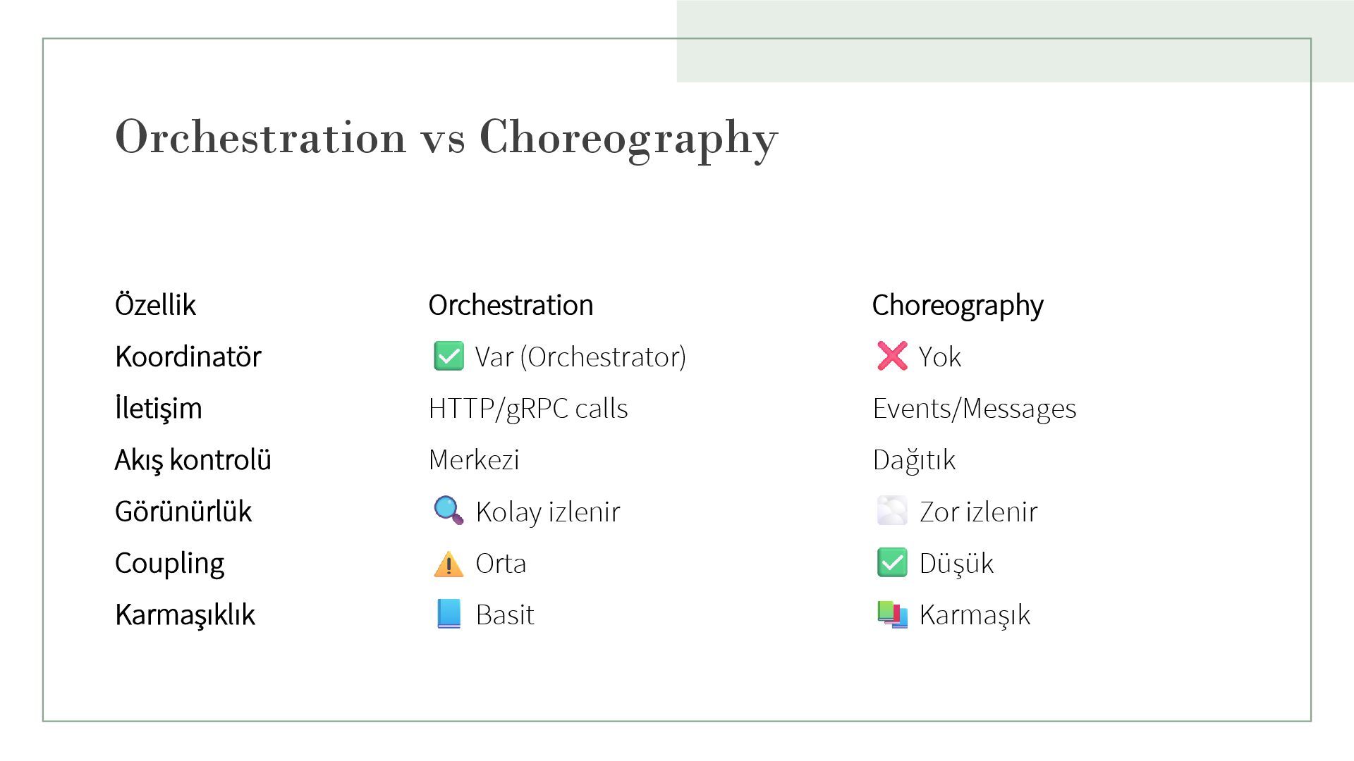 İletişim HTTP/gRPC calls Events/Messages Akış kontrolü Merkezi Dağıtık Görünürlük Kolay izlenir Zor izlenir Coupling Orta Düşük Karmaşıklık Basit Karmaşık