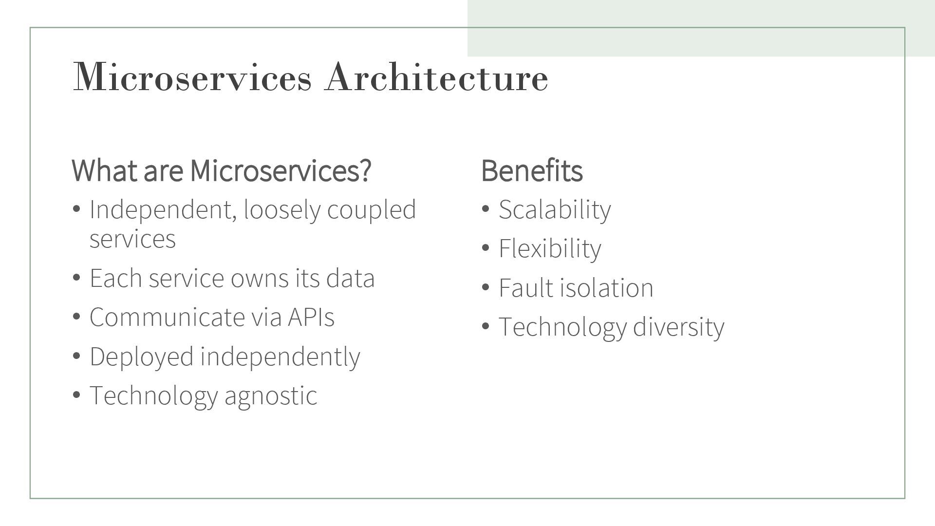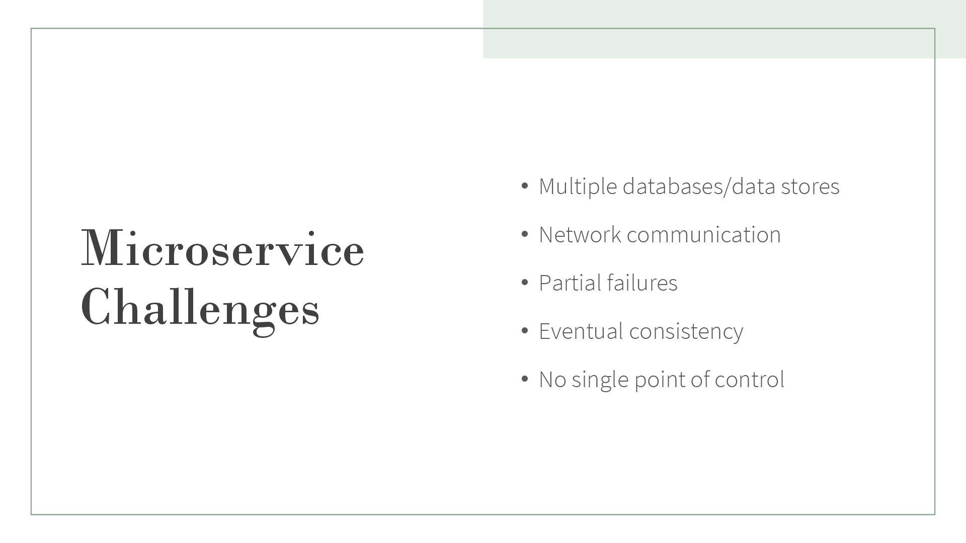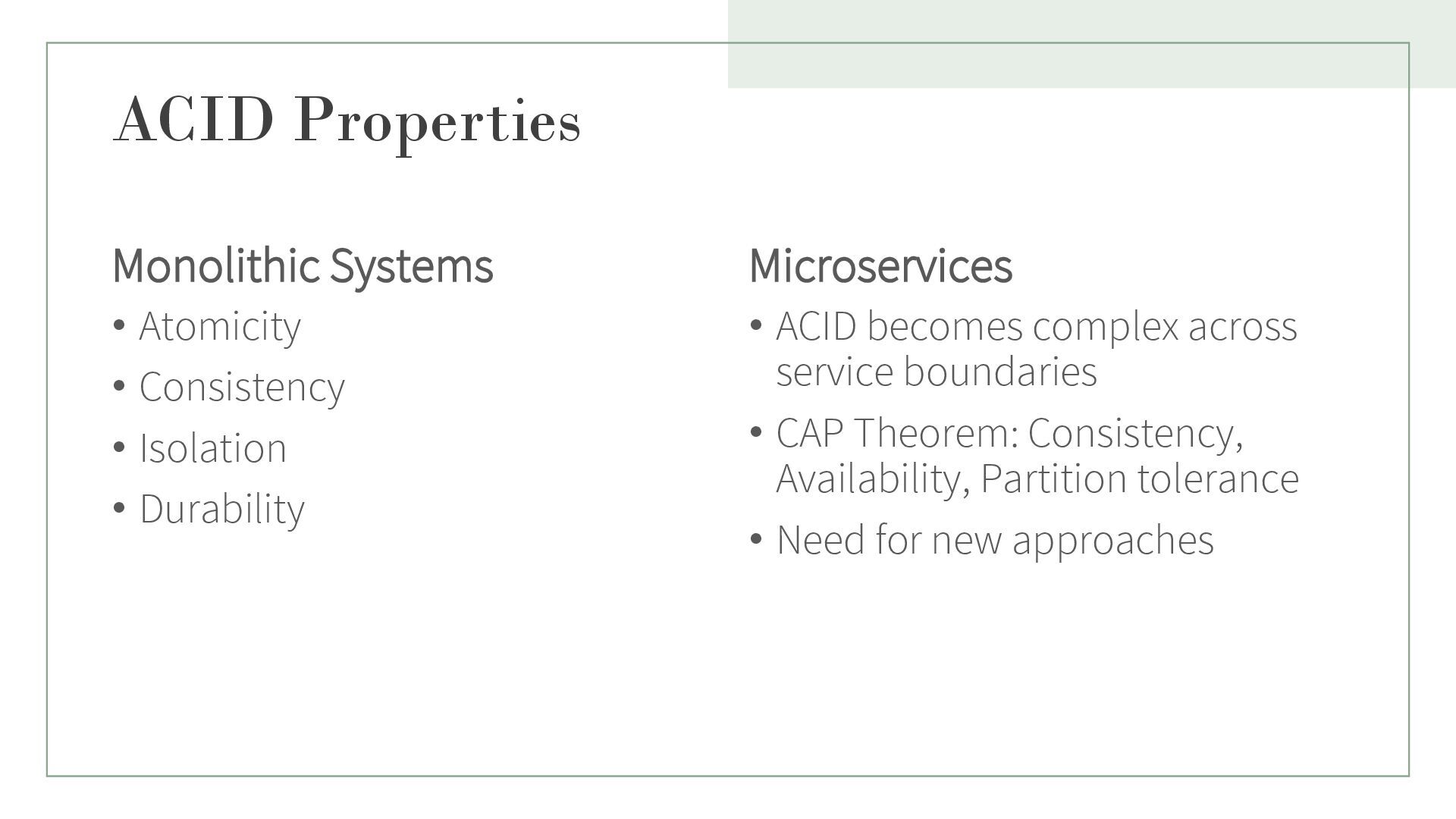 Isolation • Durability • ACID becomes complex across service boundaries • CAP Theorem: Consistency, Availability, Partition tolerance • Need for new approaches
